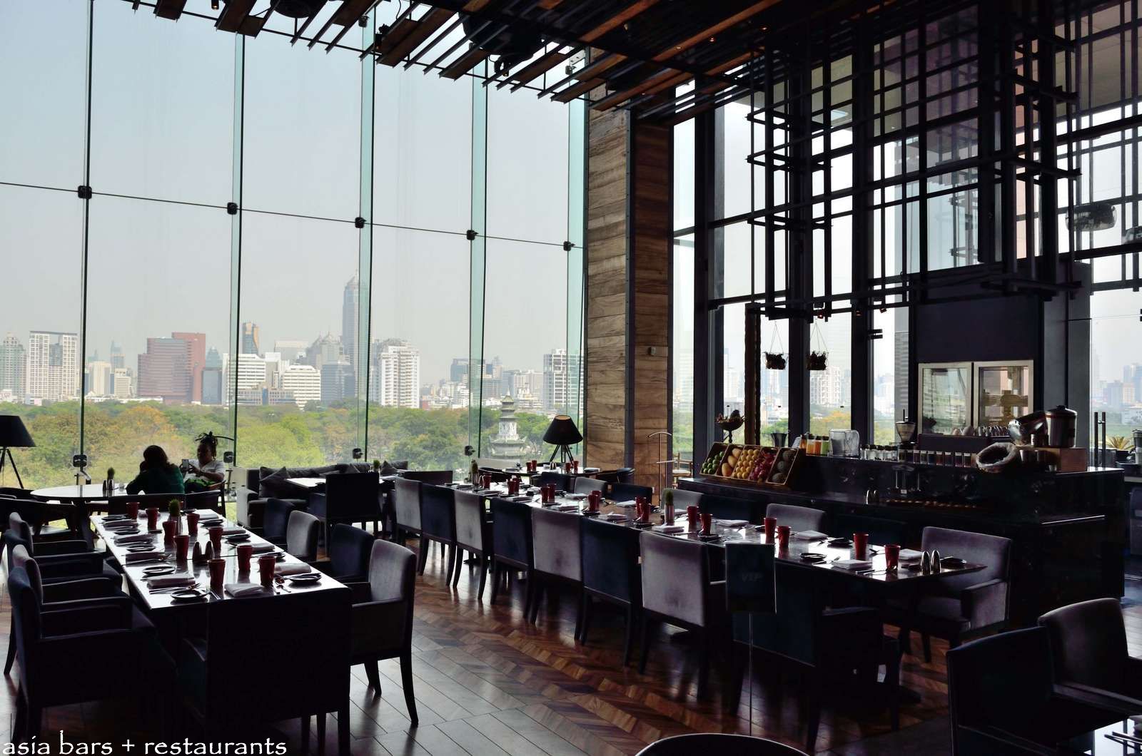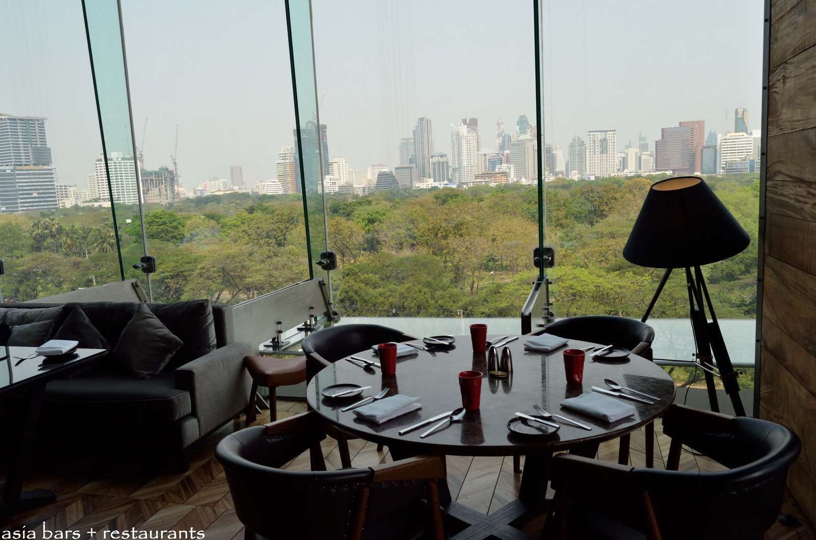 Window front tables enjoy delightful up-close views over the treetops of Lumpini Park.