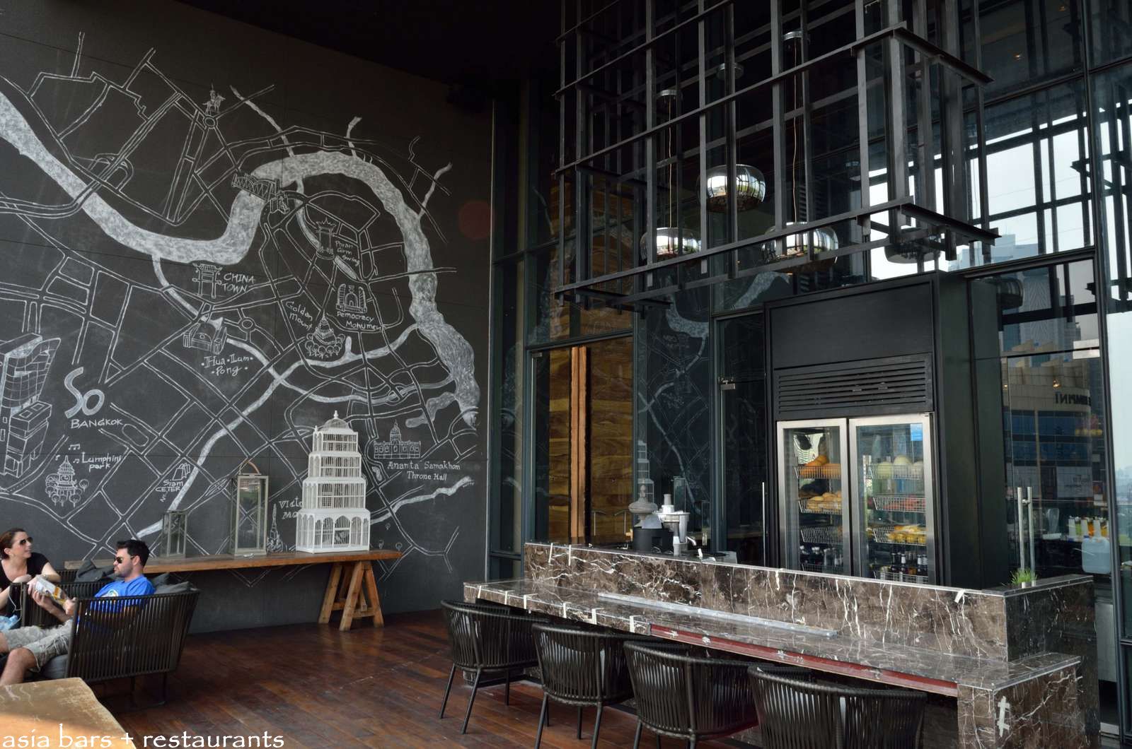 The outdoor terrace space features a dark marble bar and the casual table settings. The end wall is the canvas for a cartological mural of central Bangkok.