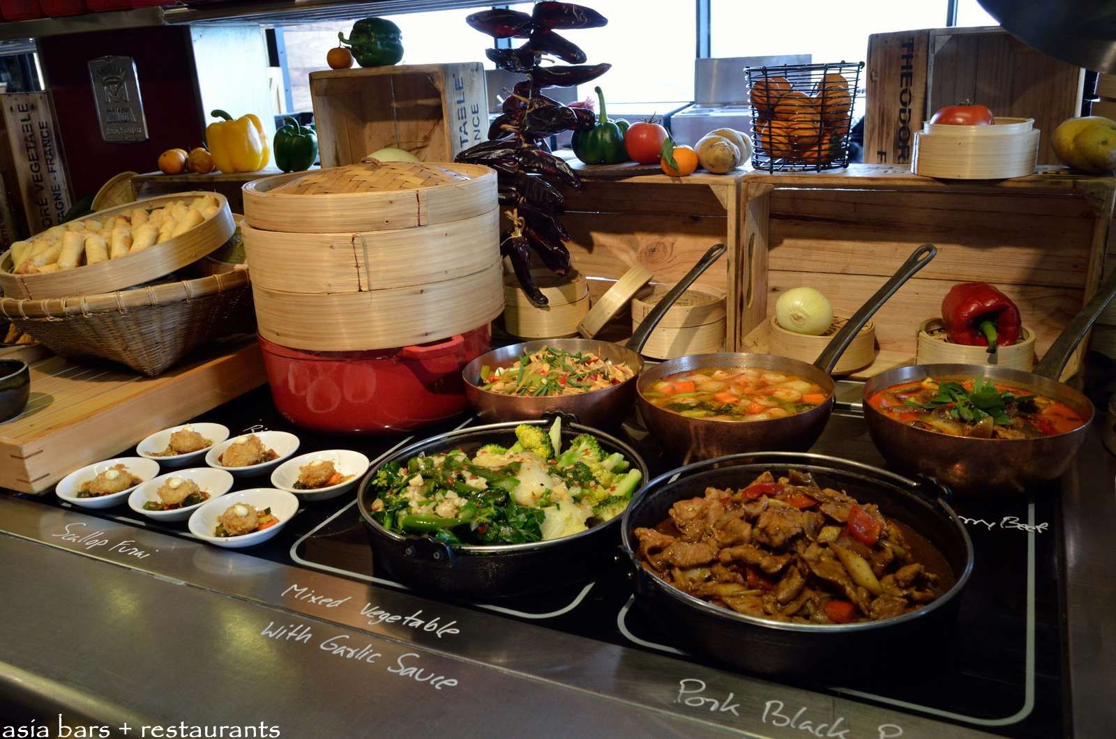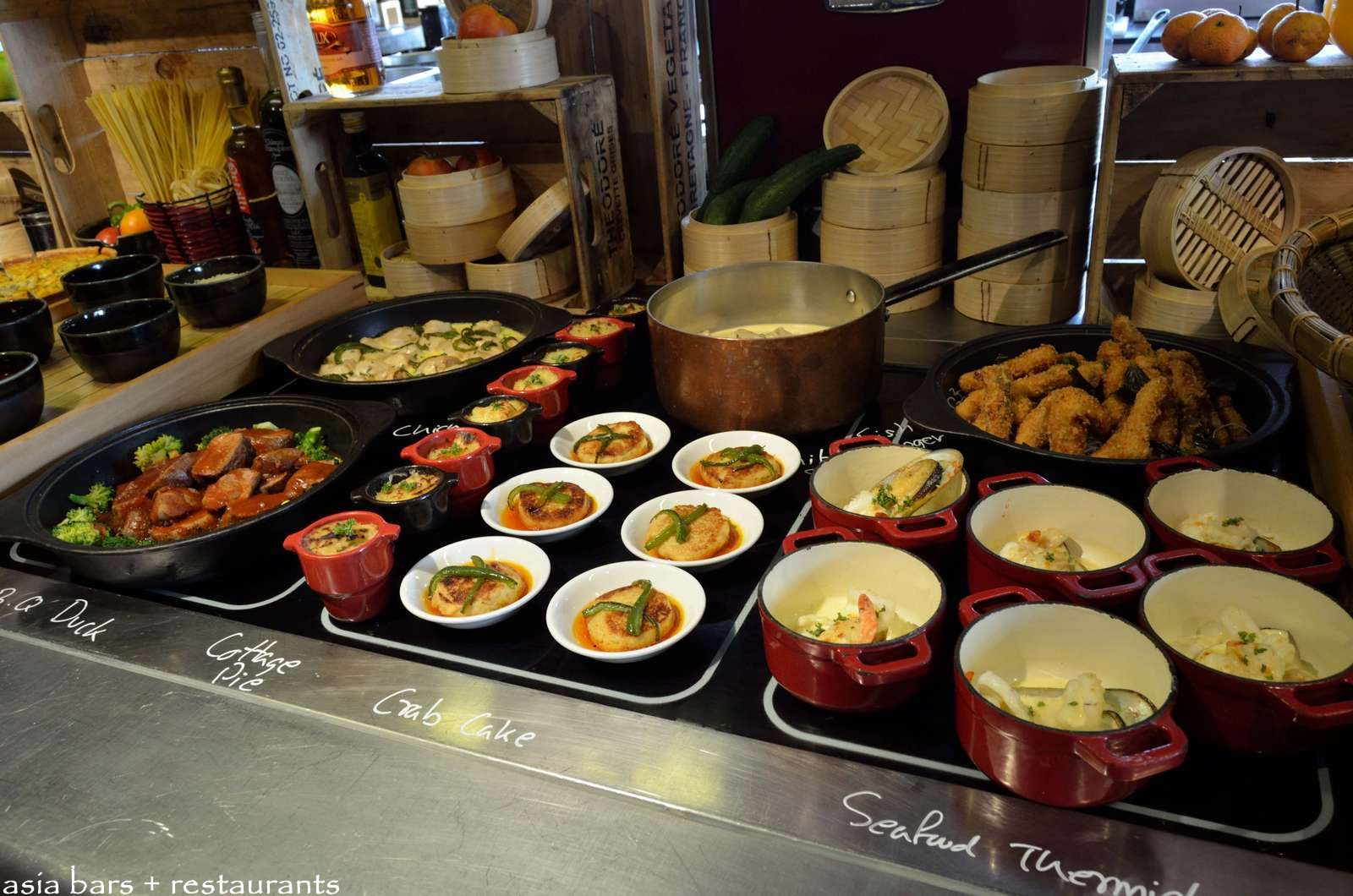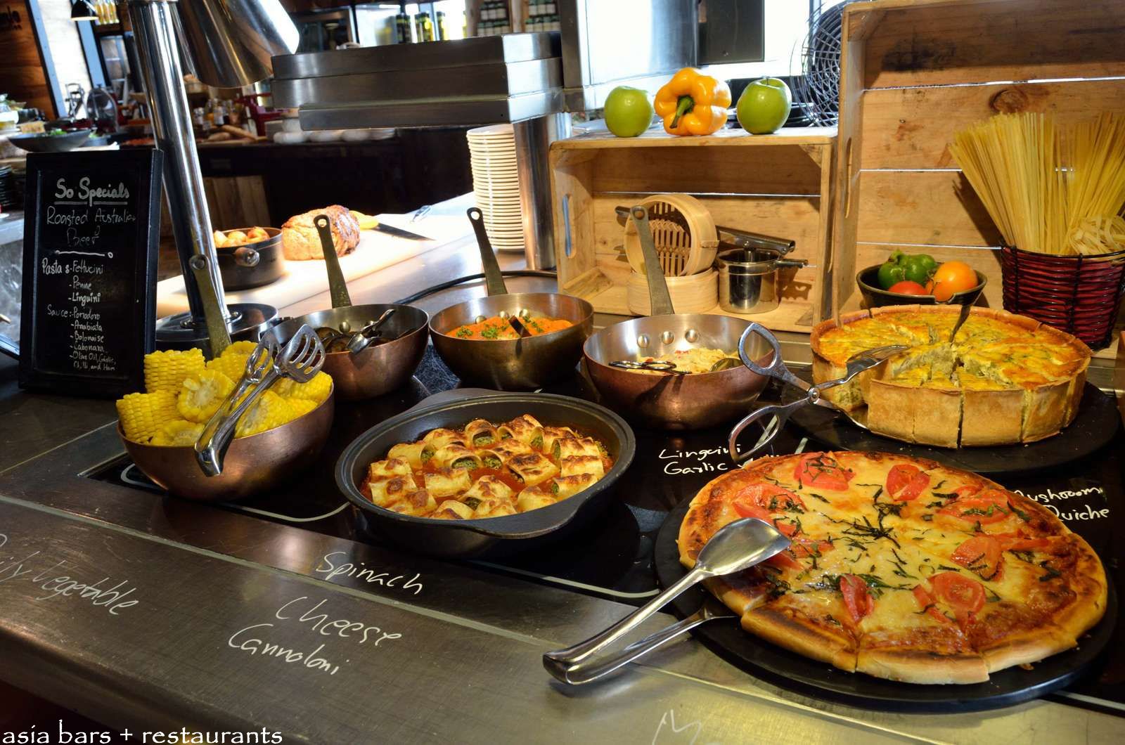 SOVEN- the centrepiece Molteni red oven- pre-cooked servings of Asian and European main courses are displayed on the entrance facing side, with the live cooking conducted at the other side of the oven.