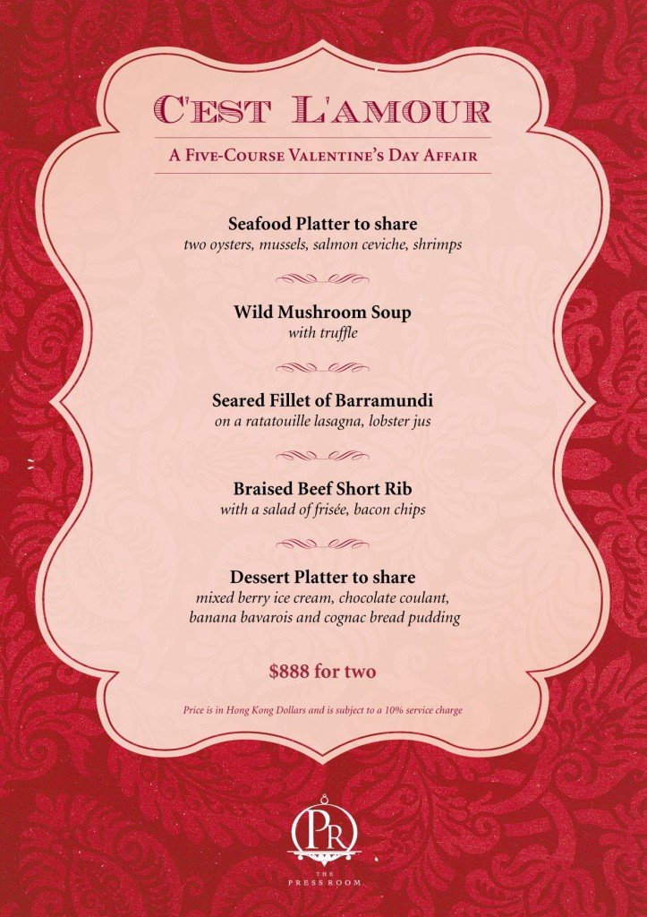 Opened for two decades now, Va Bene never fails to impress the classy crowd with its home-style Italian cuisine. Executive Chef Giuseppe Maria Brancati delights sweethearts with a three-course menu, priced at HK$528 per person. For starters, enjoy the Smoked Trout with pickled vegetables and pine nuts or Tartare of Veal with quail egg, sweet tomato and black truffle shavings. This is followed by your choice of main – Homemade Gnocchi with fish ragout, fresh tomatoes and thyme, Pan-fried Sea Bream with smoked potato foam and deep-fried zucchini, or Pork Tenderloin served with crunchy bacon and 25 year-old balsamic vinegar. Be enticed with the light Puff Pastry, filled with apple, raisin, walnuts, and vanilla sauce.