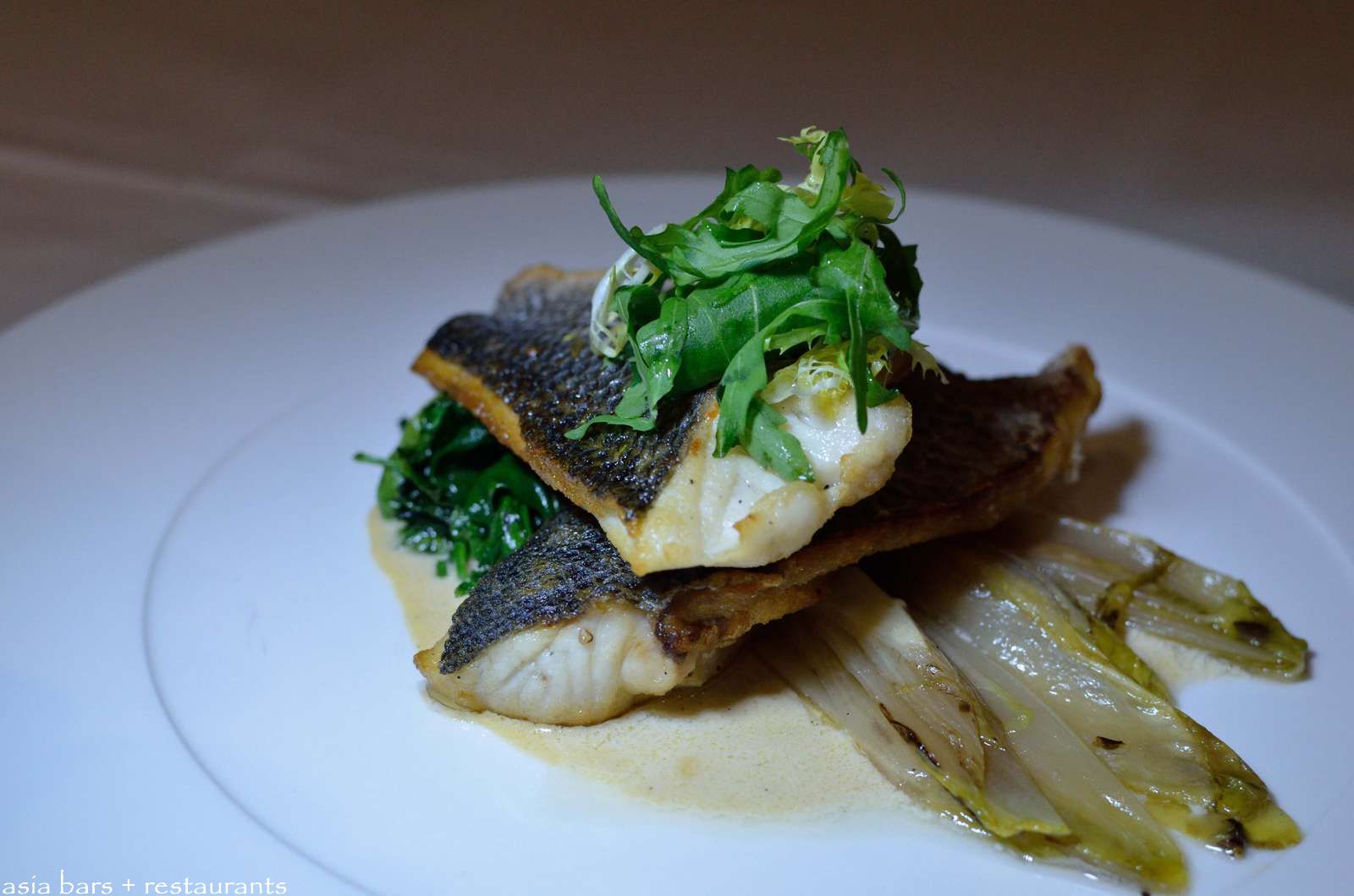Sauteed Holland Sea Bass– with braised Endives and Saffron-Vanilla sauce.
