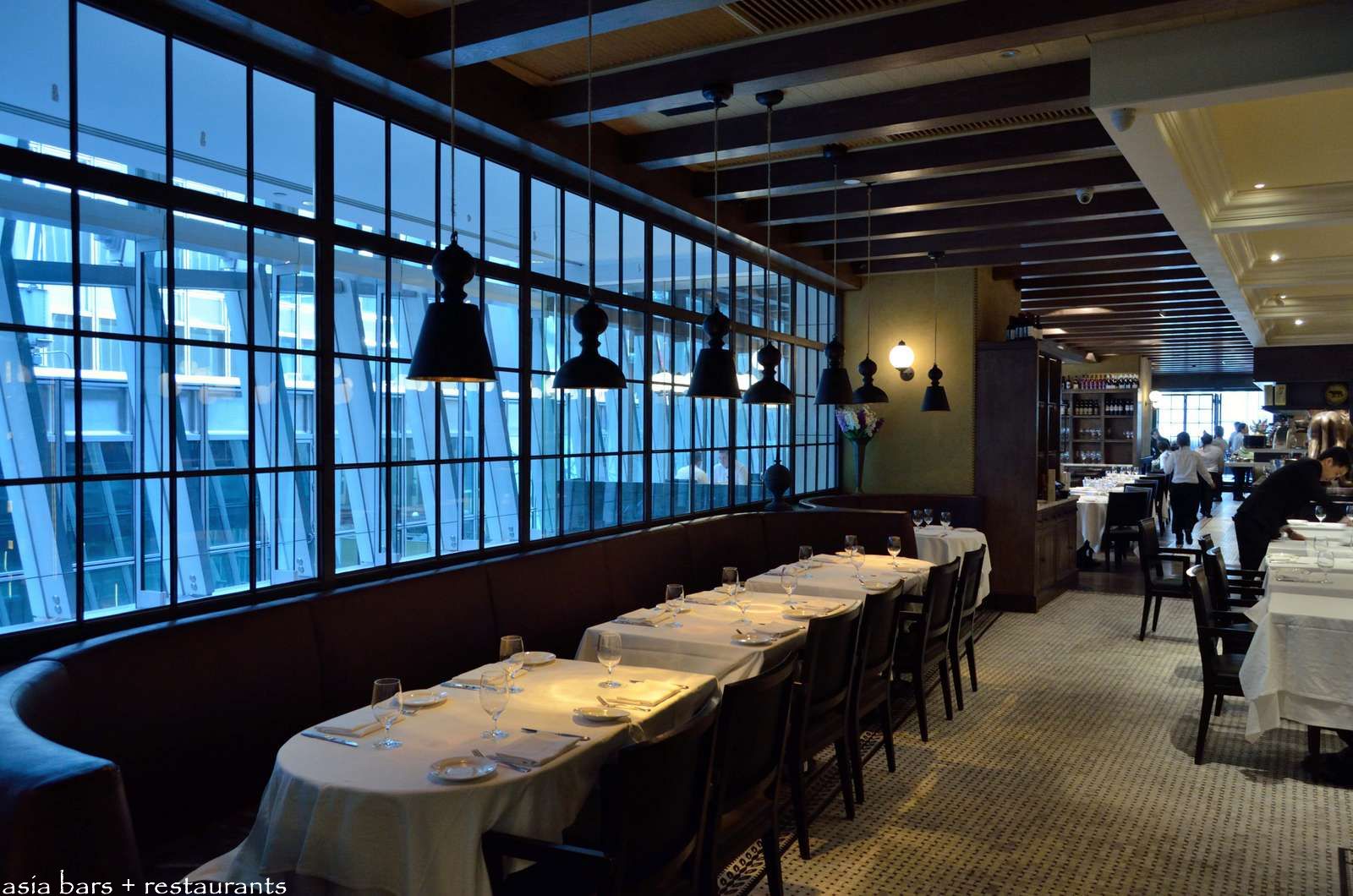 Table settings in the main dining room- a compact outdoor terrace area overlooking Queen’s Road is behind the glass doors at the end of the room. Full height glass along the side wall suffuses the interior with natural daylight and frames the view out over the streetscape below.