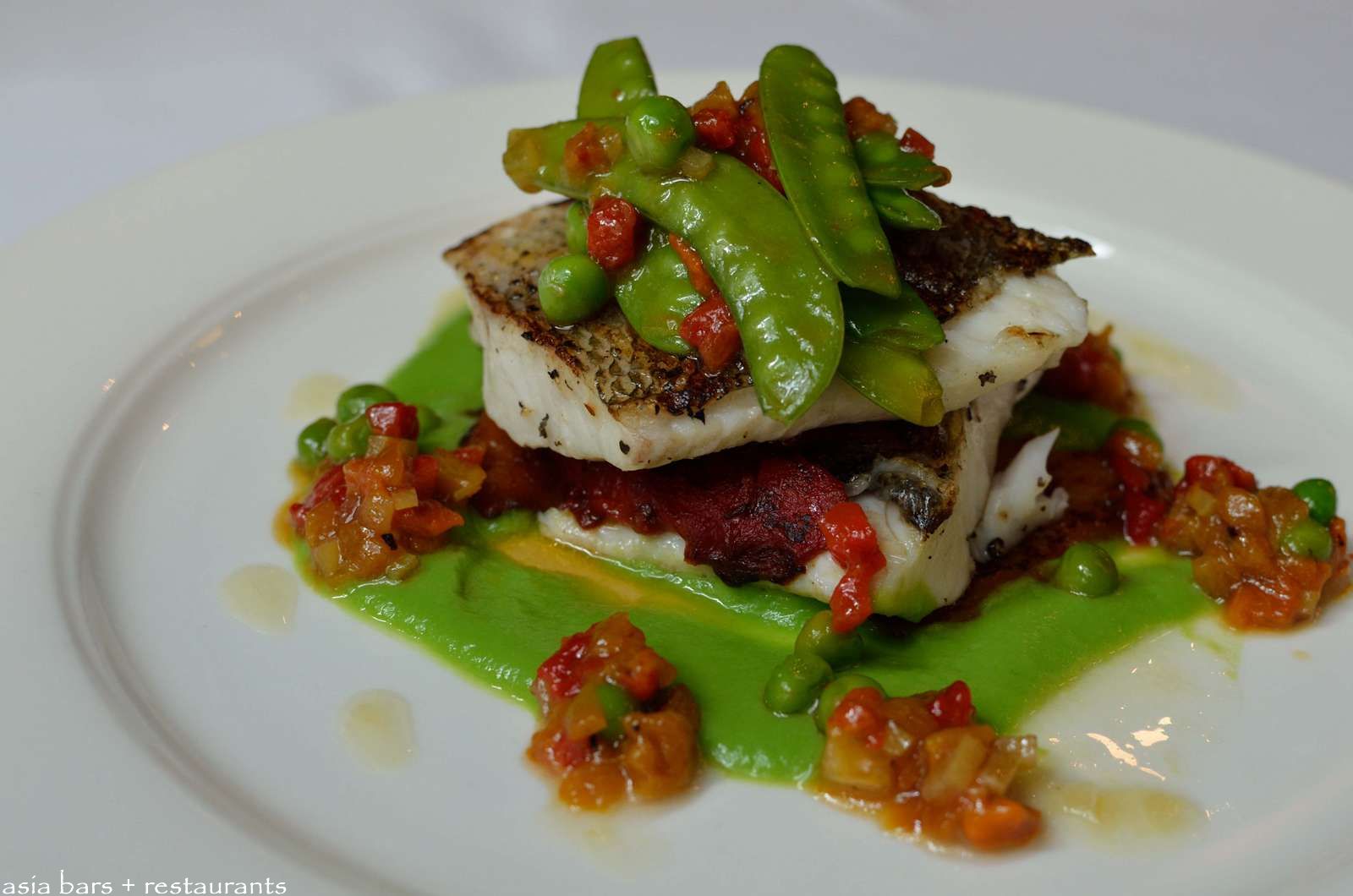 Branzino with Peas and Peperonata- Mediterranean Sea Bass with Spring Pea Puree and Marinated Peppers.