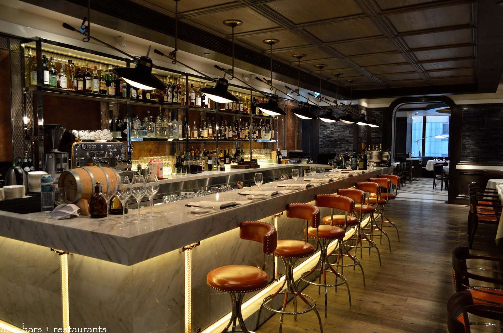 Looking back towards the entry. Industrial style lighting above the bar contrasts with the elegant white marble counter. The bar accommodates patrons with a choice of seating – either at the bar counter, or at the dark brown leather banquette table settings across the back wall.