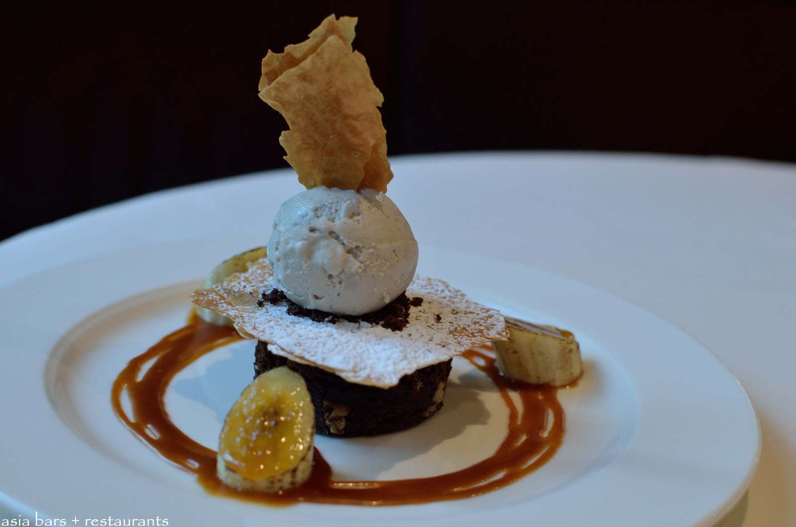 Chocolate-Banana Brownie- served with Roasted Banana Ice Cream and Caramel Sauce.