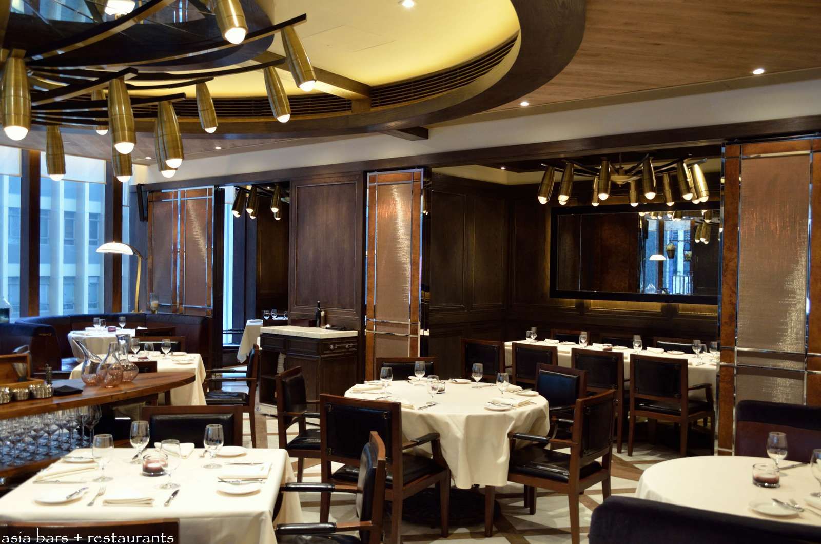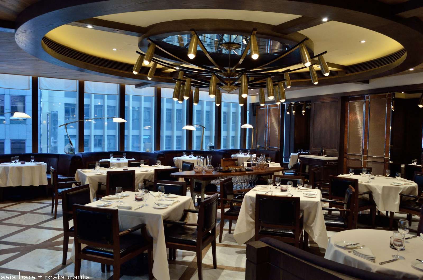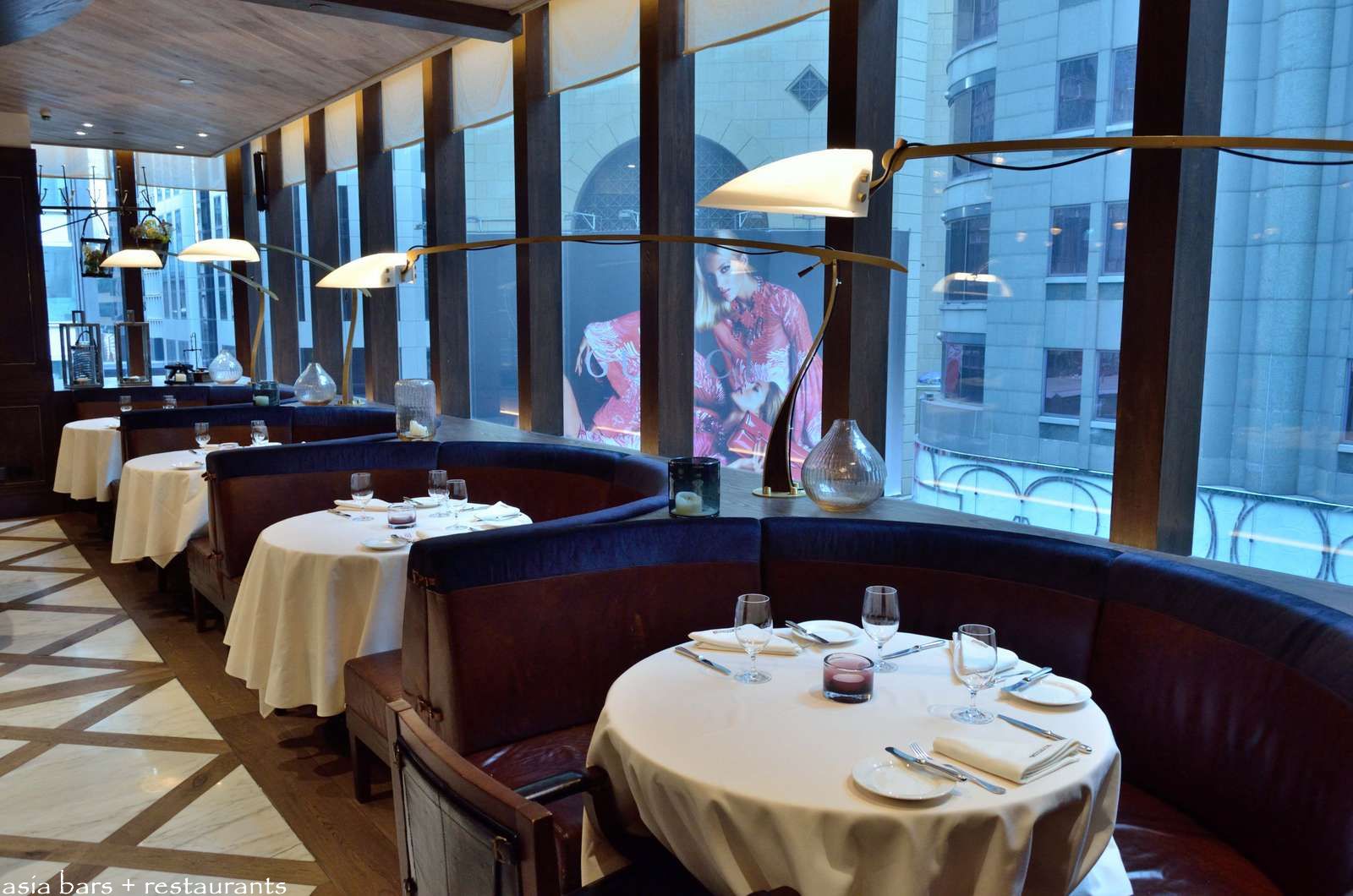 Semi-circular leather upholstered booths extend across the front of the dining room overlooking Queen’s Road below.