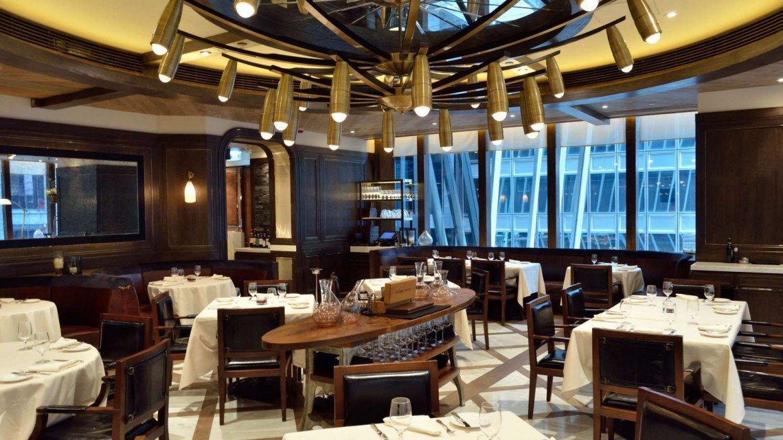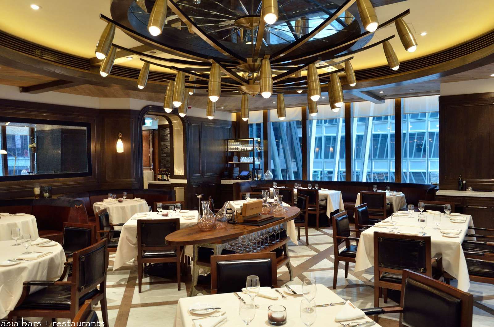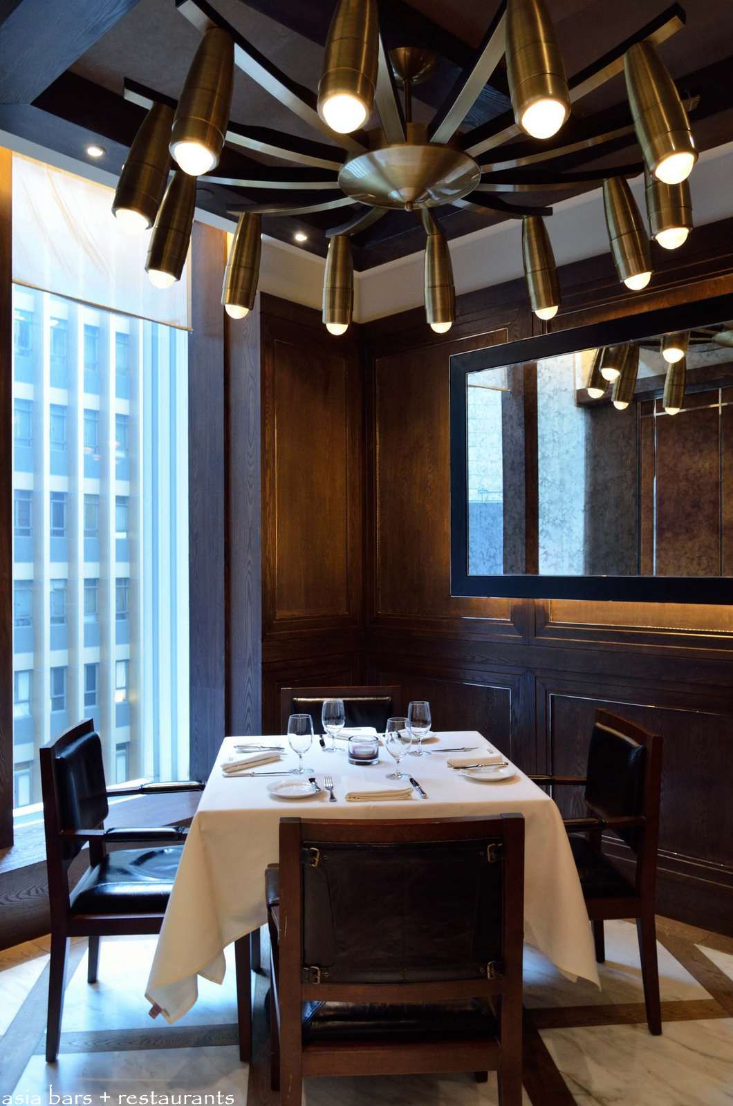 Semi-circular leather upholstered booths extend across the front of the dining room overlooking Queen’s Road below.