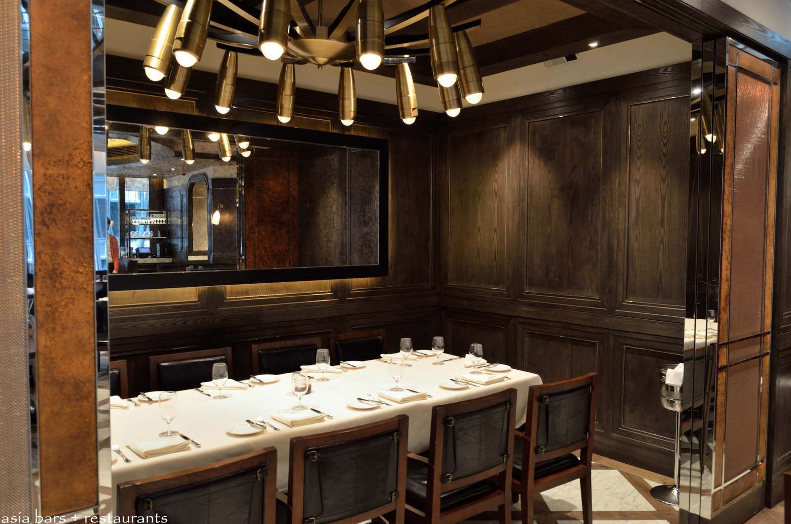 One of the luxurious private dining rooms – sleek, sliding panels of chrome-edged walnut veneer and polished nickel metal grille can be closed to ensure complete privacy.