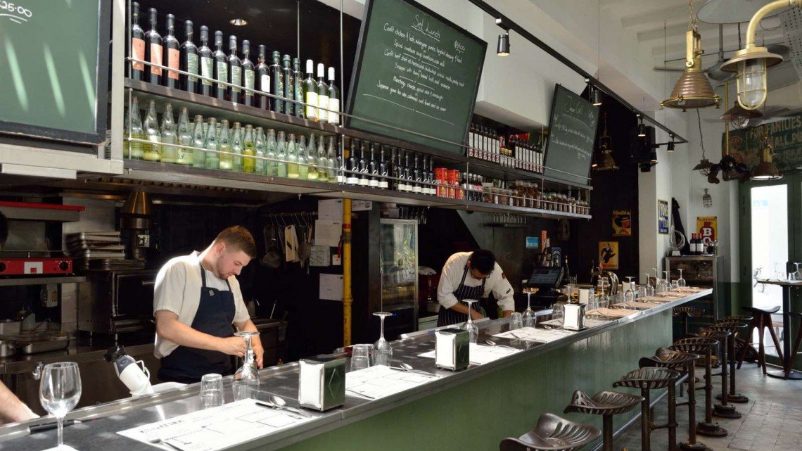 The compact and narrow interior space of ESQUINA features an open kitchen and counter-top dining. The decor includes an eclectic collection of antique lamps and light fittings, vintage metal advertising signs, and seating on metal bar stools specially designed by a group of UK artists, crafted from recycled tractor seats.