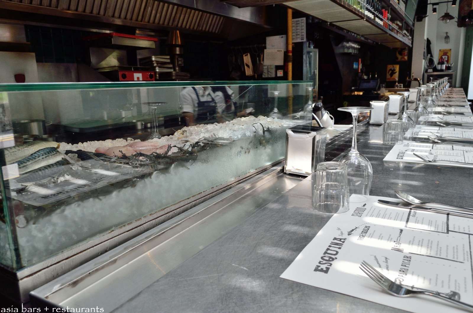 A long stainless steel-topped counter seats 12 diners- seated facing across the counter to the open kitchen area. Behind glass is the seafood counter displaying the fresh fish of the day on a bed of ice.