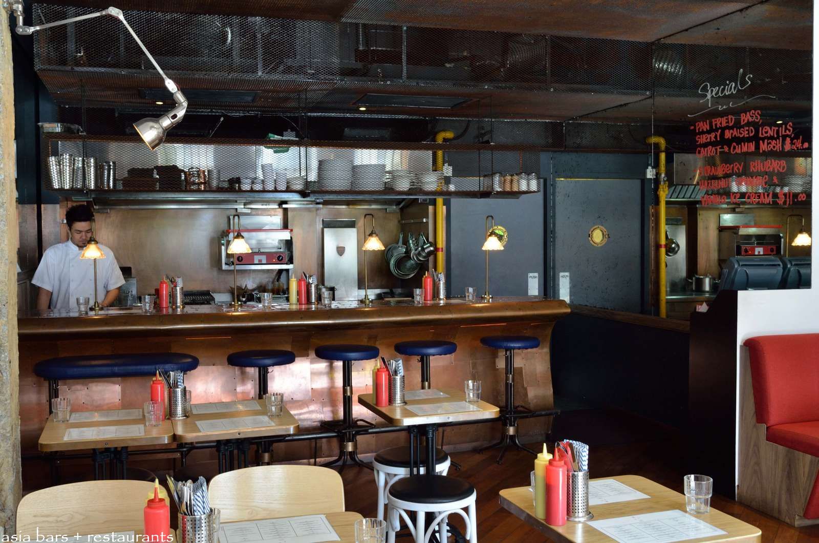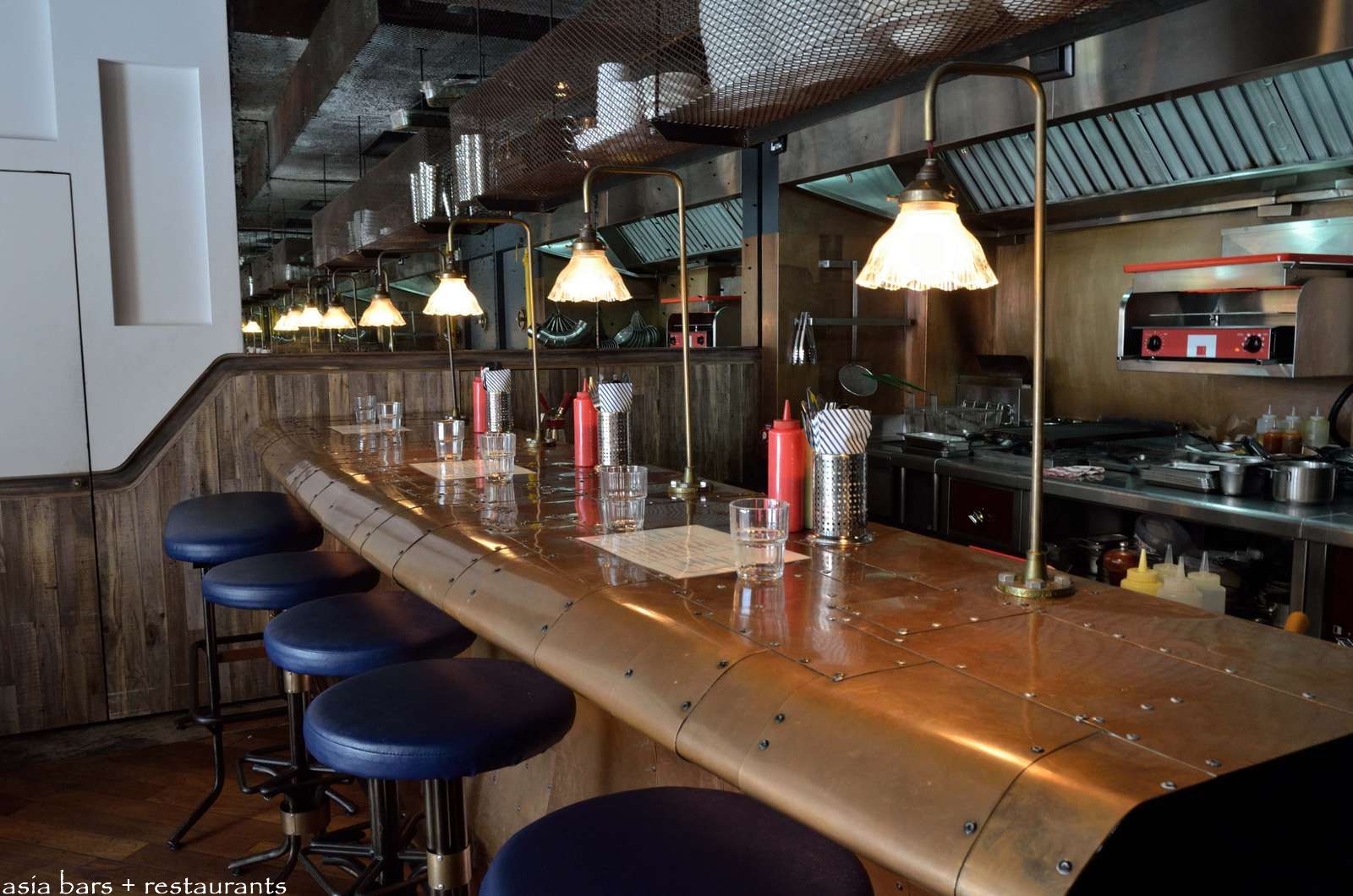 The dramatic copper sheaved and riveted bar counter, with individual antique lamps for each diner, separates the open kitchen from the cafe tables. Overhead shelves of rusted steel mesh hold crockery and kitchen supplies.