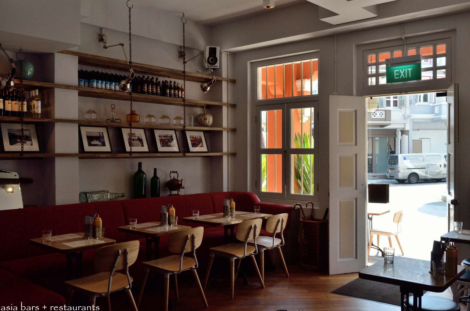 Shelving on one wall of the compact cafe interior displays old photographs of the streetscape and other antique paraphernalia. A comfortable red banquette extends across the side wall. The total seating capacity of KSS is 30 patrons.