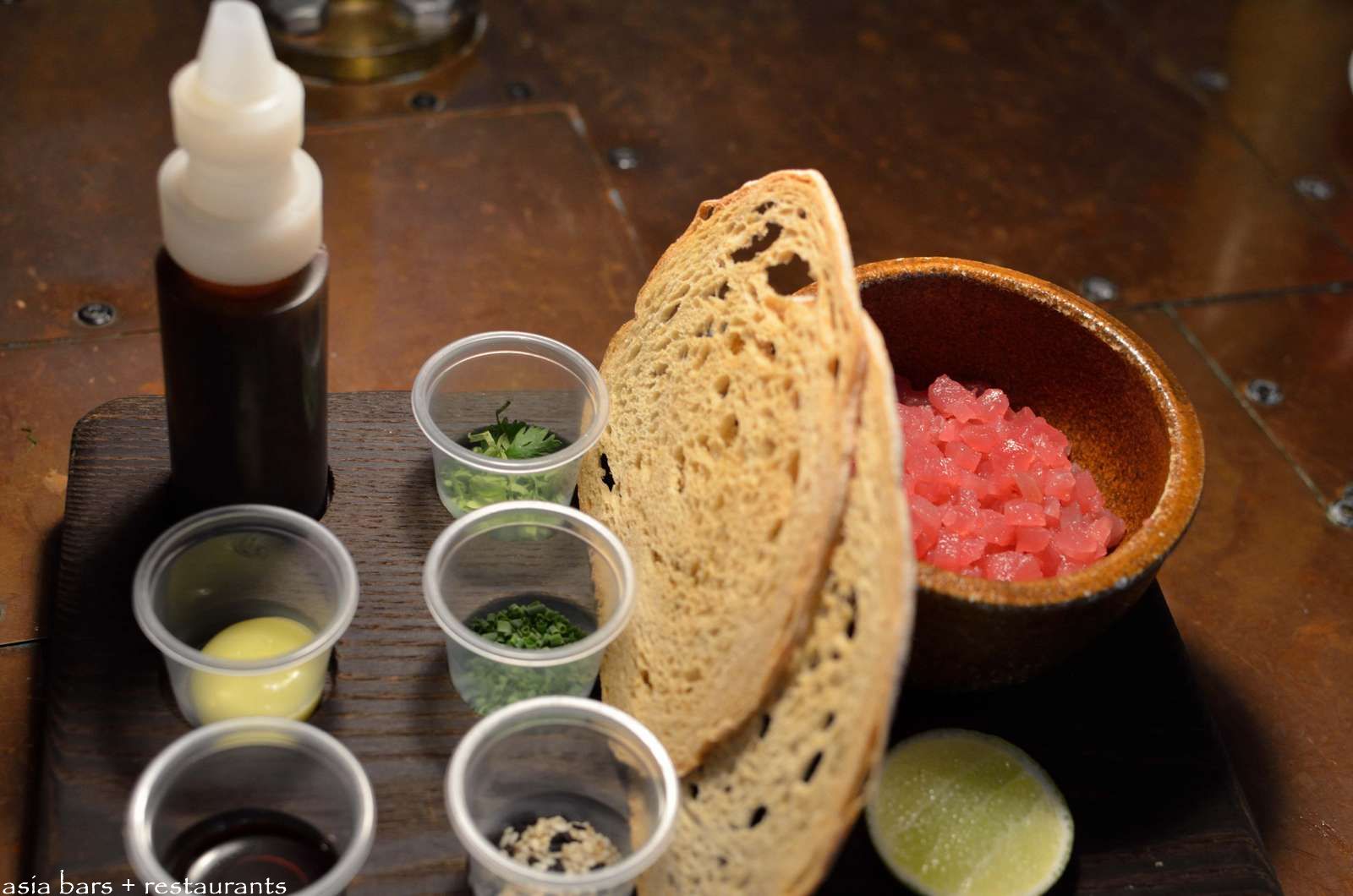 D-I-Y Tuna Tartare- diced raw tuna , various condiments including roasted sesame seeds, soya sauce, chopped chives, lime, cilantro and Japanese sauce. (S$17)
