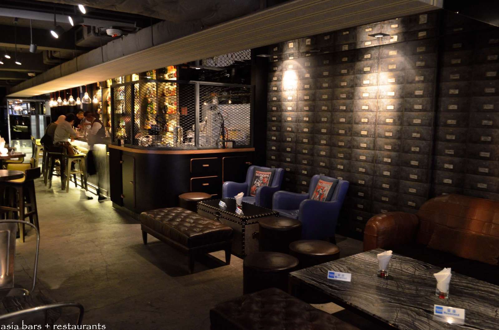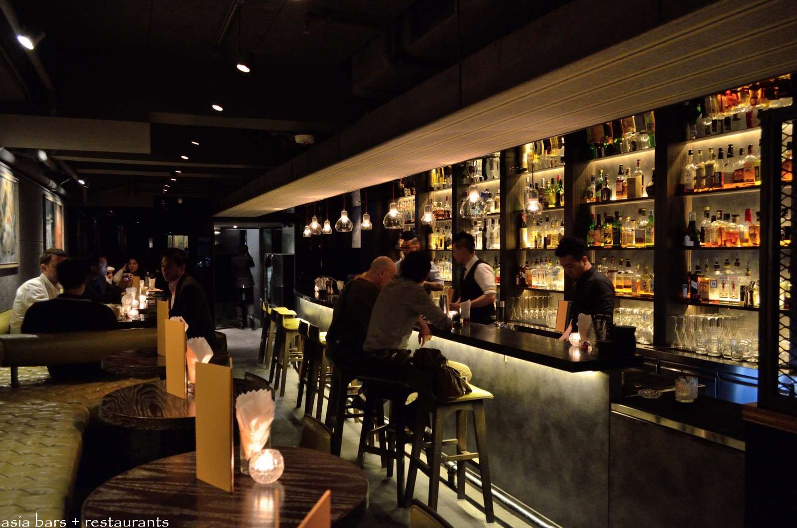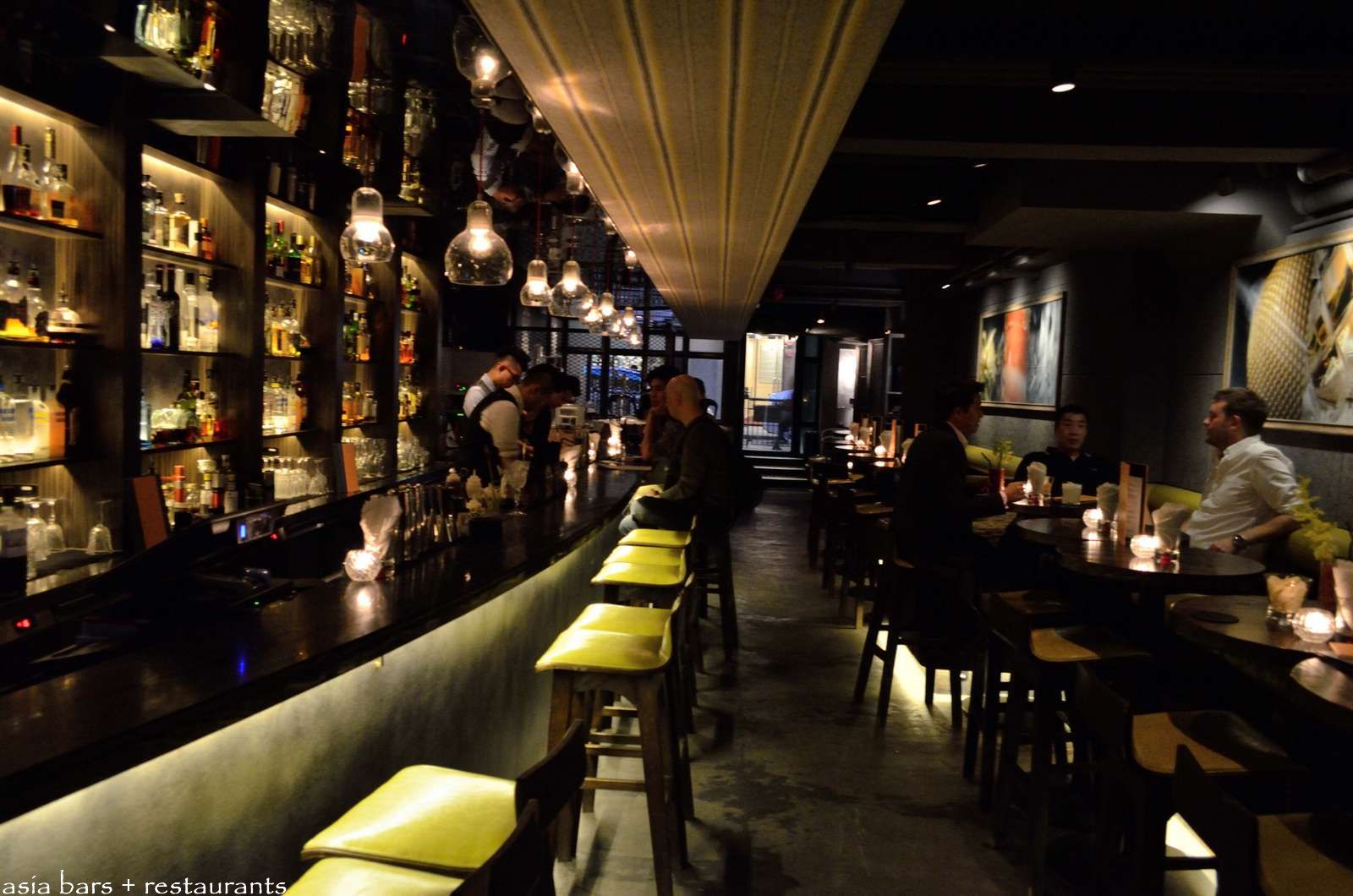 The bar counter spans one side of the room- with raised leather banquette and high table settings extending along the facing wall.