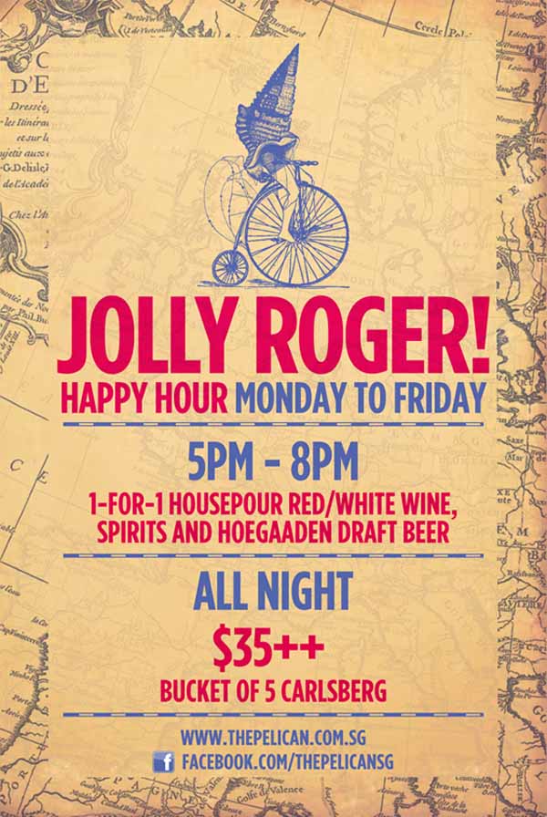 “Jolly Roger” Happy Hour 5:00 pm ~ 8:00 pm . 1-for-1 on house red and white wines, spirits, and Hoegaarden beer on draft.