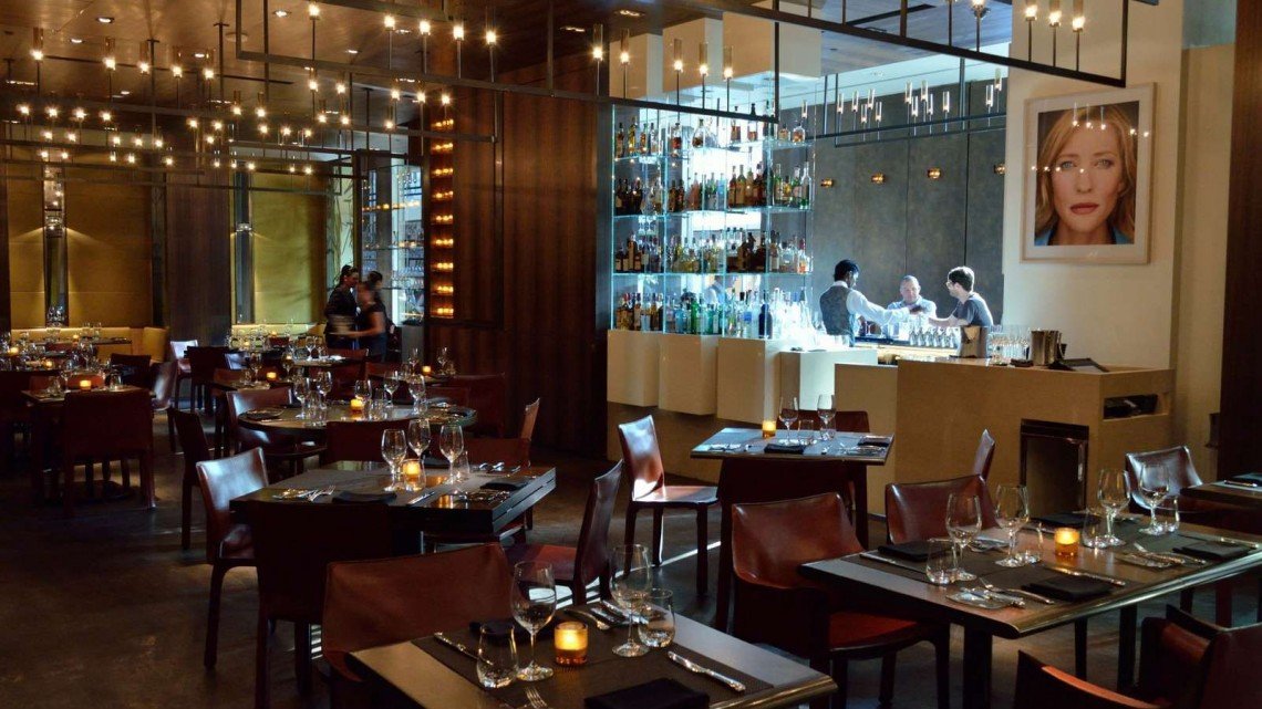 The main CUT dining room features modern bronze metal lighting fixtures that dim to a comfortably subdued, discrete level. The bar area at the front is partially open into the dining space.