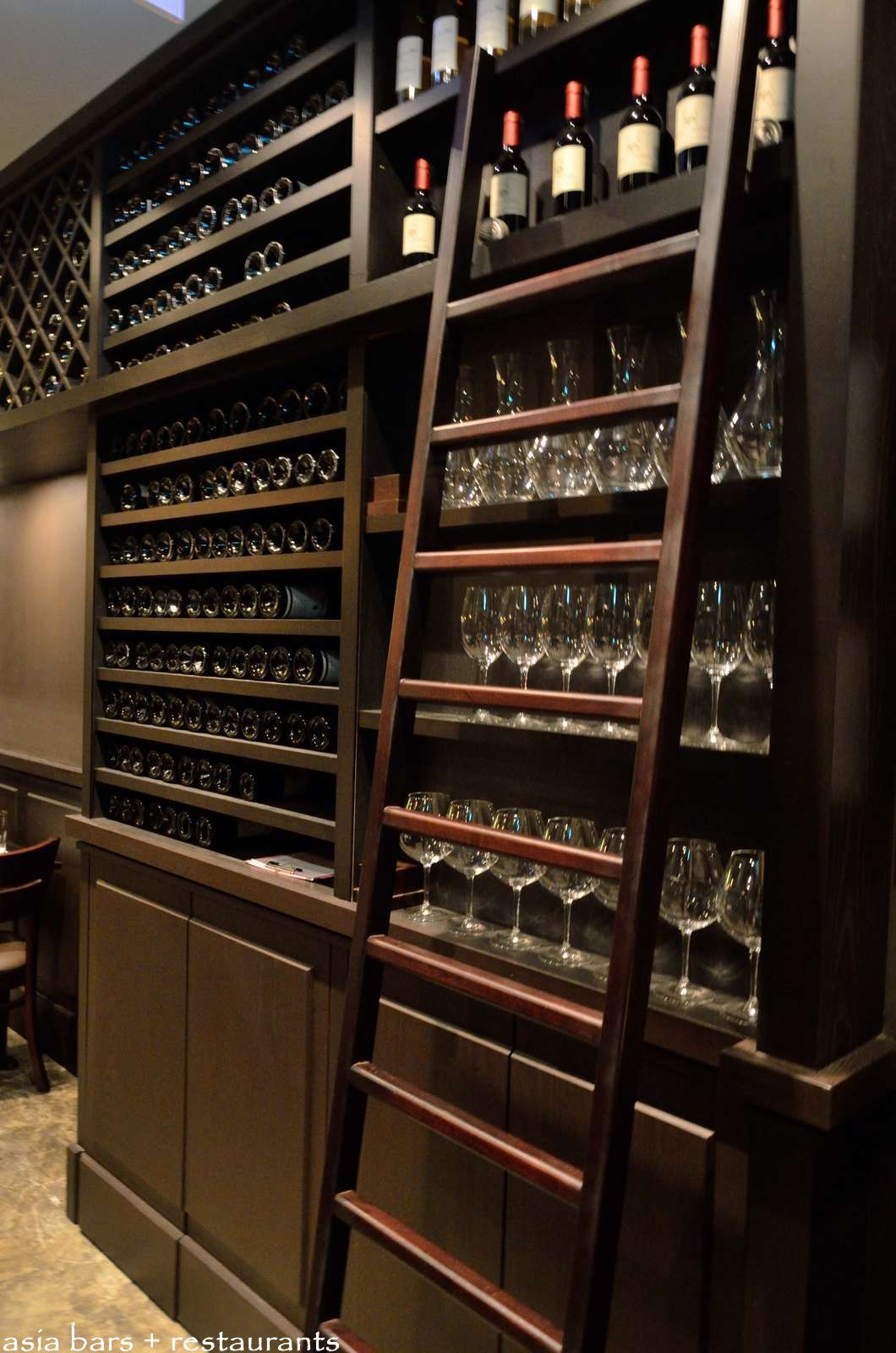 Dark timber wine racks and shelving adjacent to the entrance showcase the featured 100 wines listed at under $100.