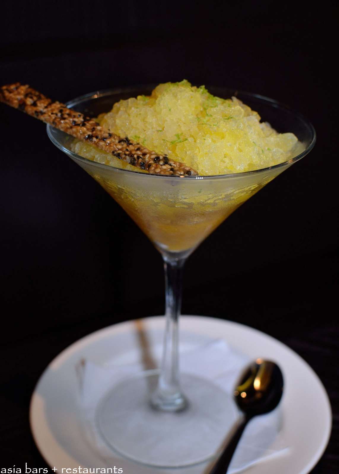 Orange Martini- home-made orange confit, layered with Grand Marnier jelly and covered with finely shaved orange granita, with a sesame tuile (S$15)