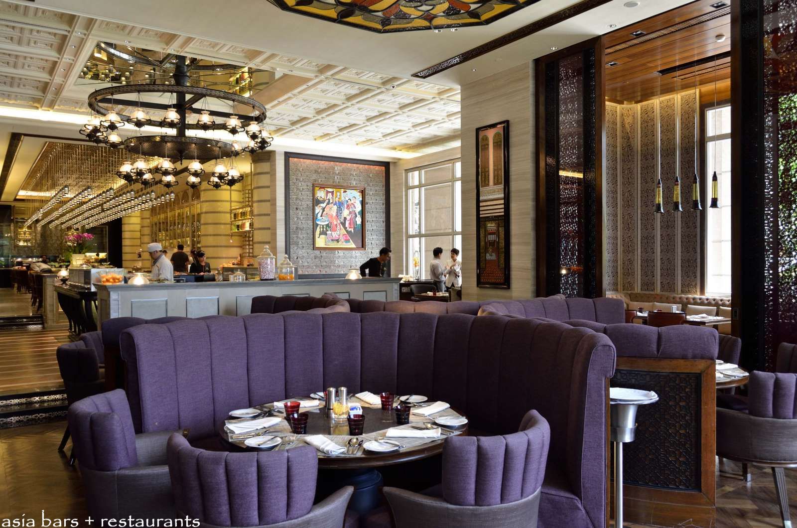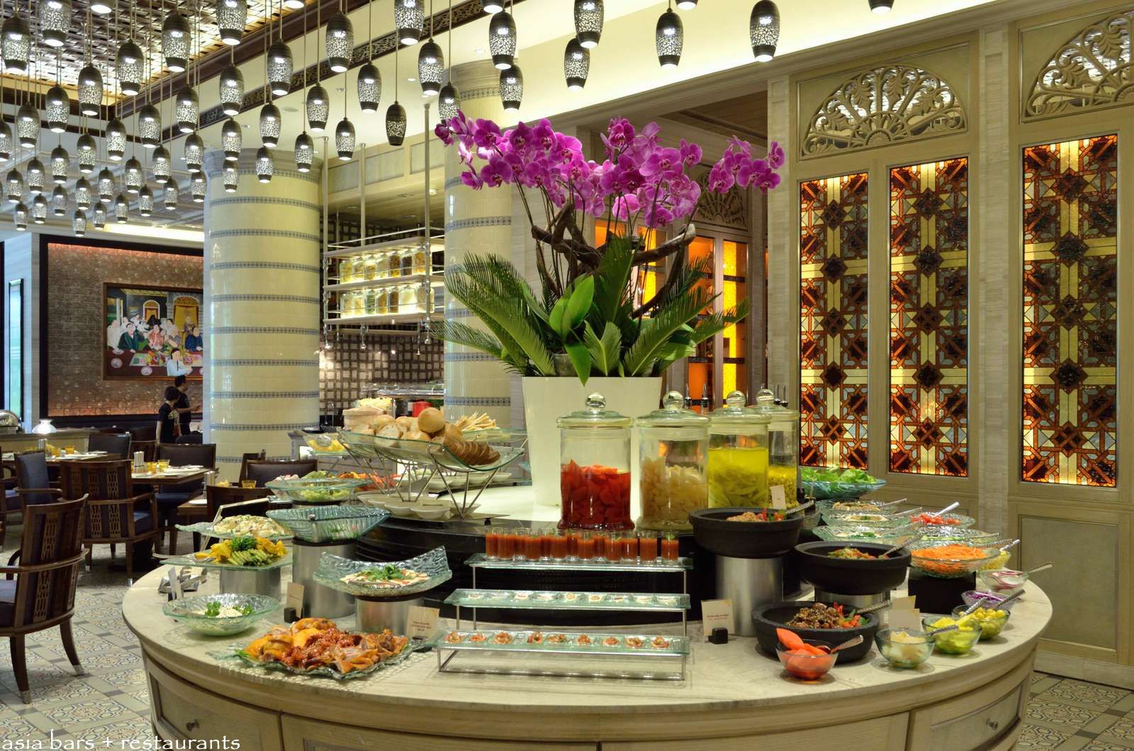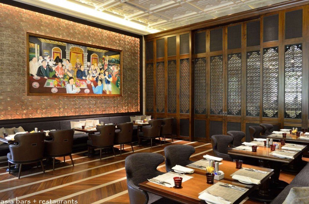 The design concept references the uniquely local Peranakan culture- a centuries old melting pot of Malay, Indonesian, and Chinese heritage that was centred around the historic trading port of Melaka. Drawing on the rich cultural heritage of the Peranakan, Spin Studio Design have created an exquisitely executed interior that incorporates these historical influences within a boldly stylish, contemporary decor. Elaborately detailed wall and ceiling paneling are highlighted by the spectacular array of suspended pewter pendant light fittings that extend the entire length of the upper half of the interior. Intricately carved dark timber wall screens and panels are featured, together with vibrantly colorful local artworks.