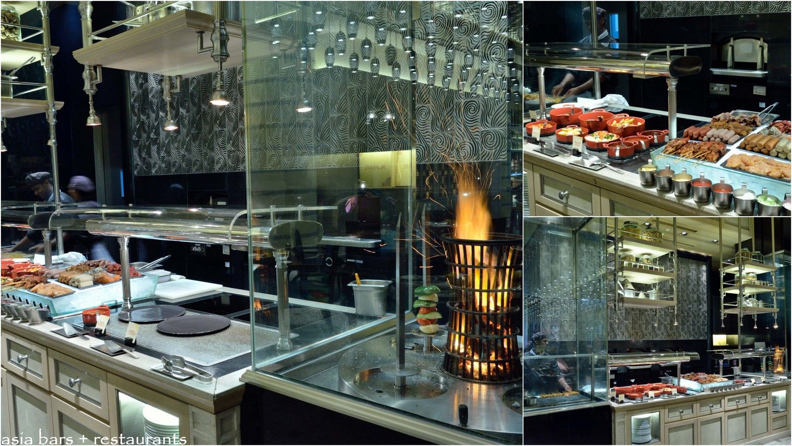 Table settings in the upper section place diners in close proximity to the live cooking stations for an enthralling, interactive culinary experience.