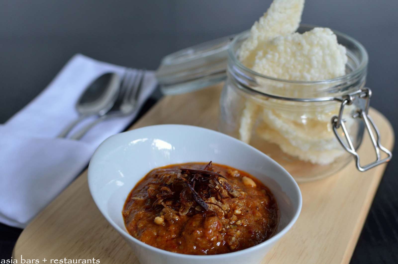 Crispy rice crackers with prawn, pork & peanut candy relish