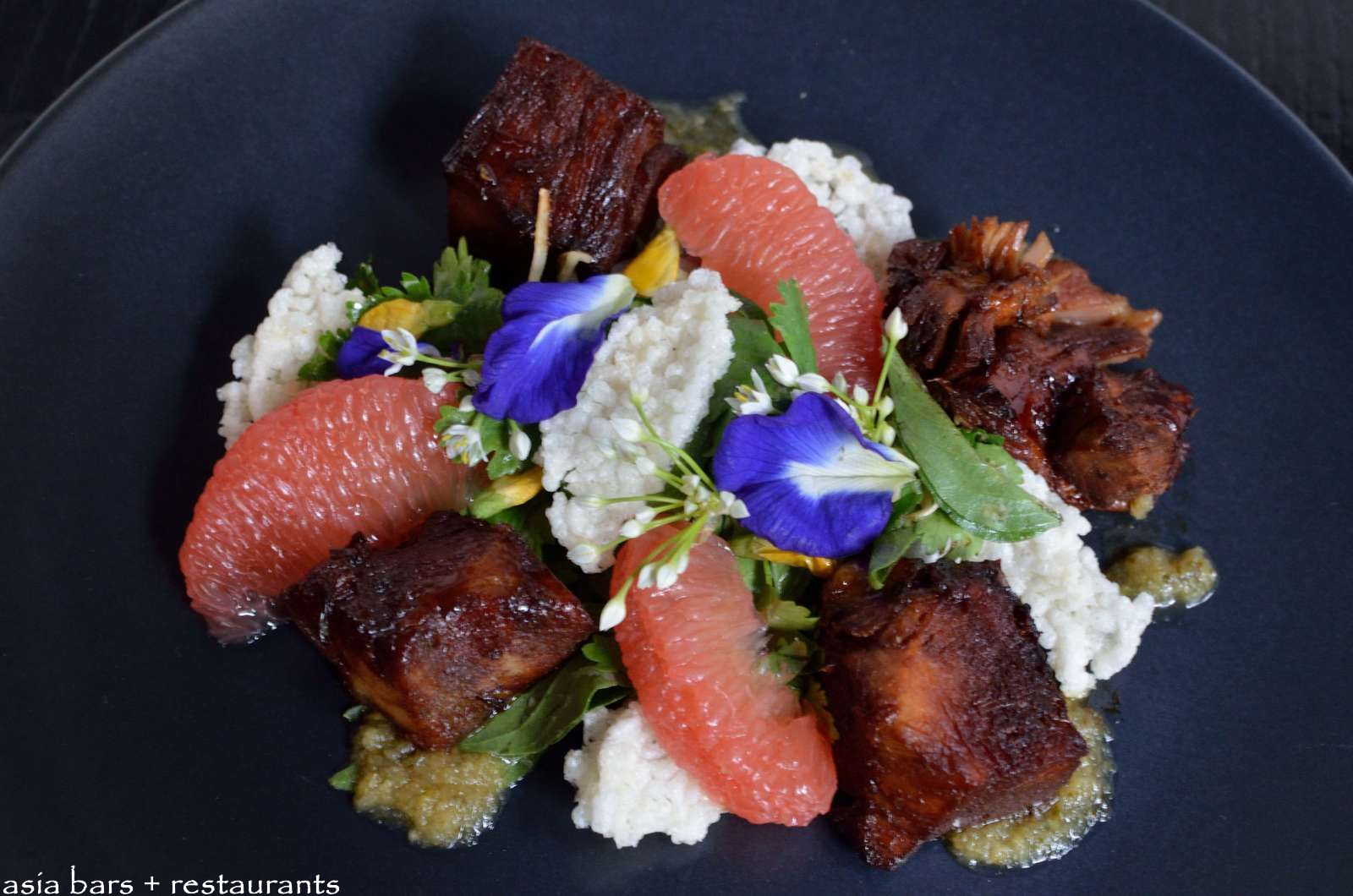 Master stock poached organic pork neck with chilli, red grapefruit, toasted sticky rice & local Thai flowers
