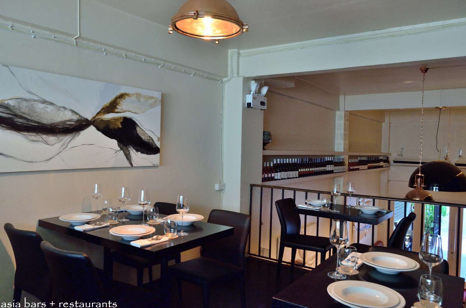 A compact mezzanine level above the kitchen houses the bar and a few additional dining tables. Industrial style luminaires suspended from the ceiling throughout the room reference a pared-back functionality of design. Contemporary artworks from a local Thai artist blend harmoniously with the interior decor.