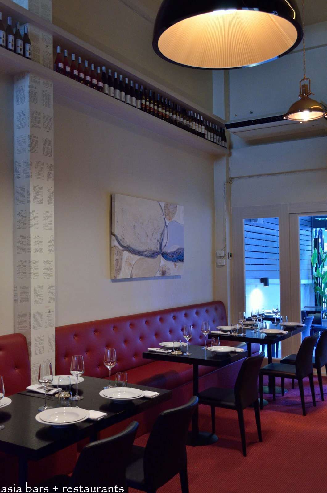 Inside- the main dining room has a spaciousness that belies the narrow floorspace- with the double height ceiling adding comfortable volume to the room. A series of plush red leather banquette table settings are arranged down one side of the room.