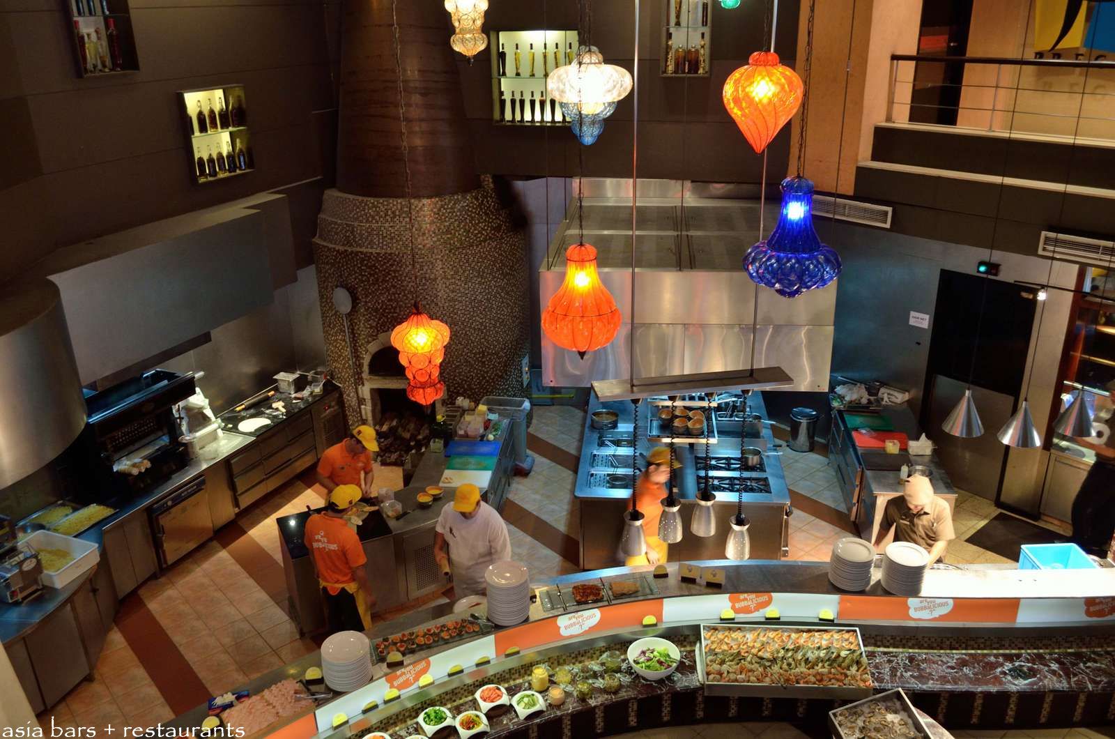 Looking down into the spacious open kitchen of Prego- with its numerous cooking stations- including the prominent wood-fired pizza oven.