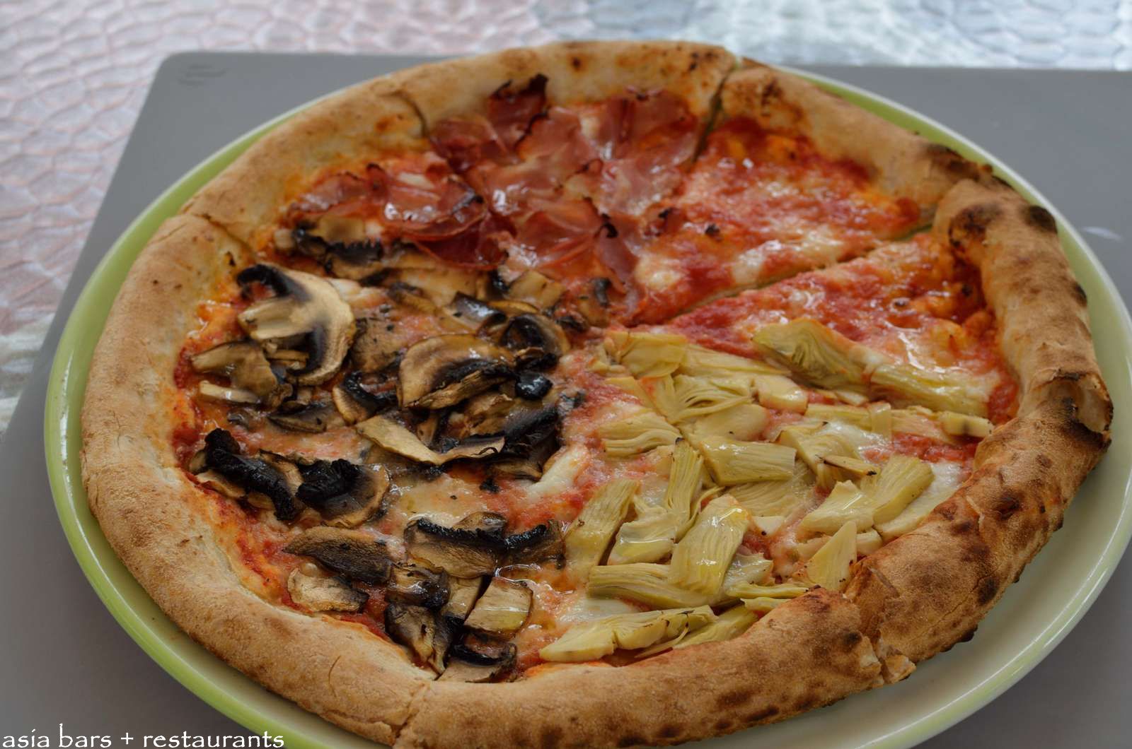 PIZZA QUATTRO STAGIONI– Tomatoes, Mozzarella, Artichokes, Ham, Mushroom