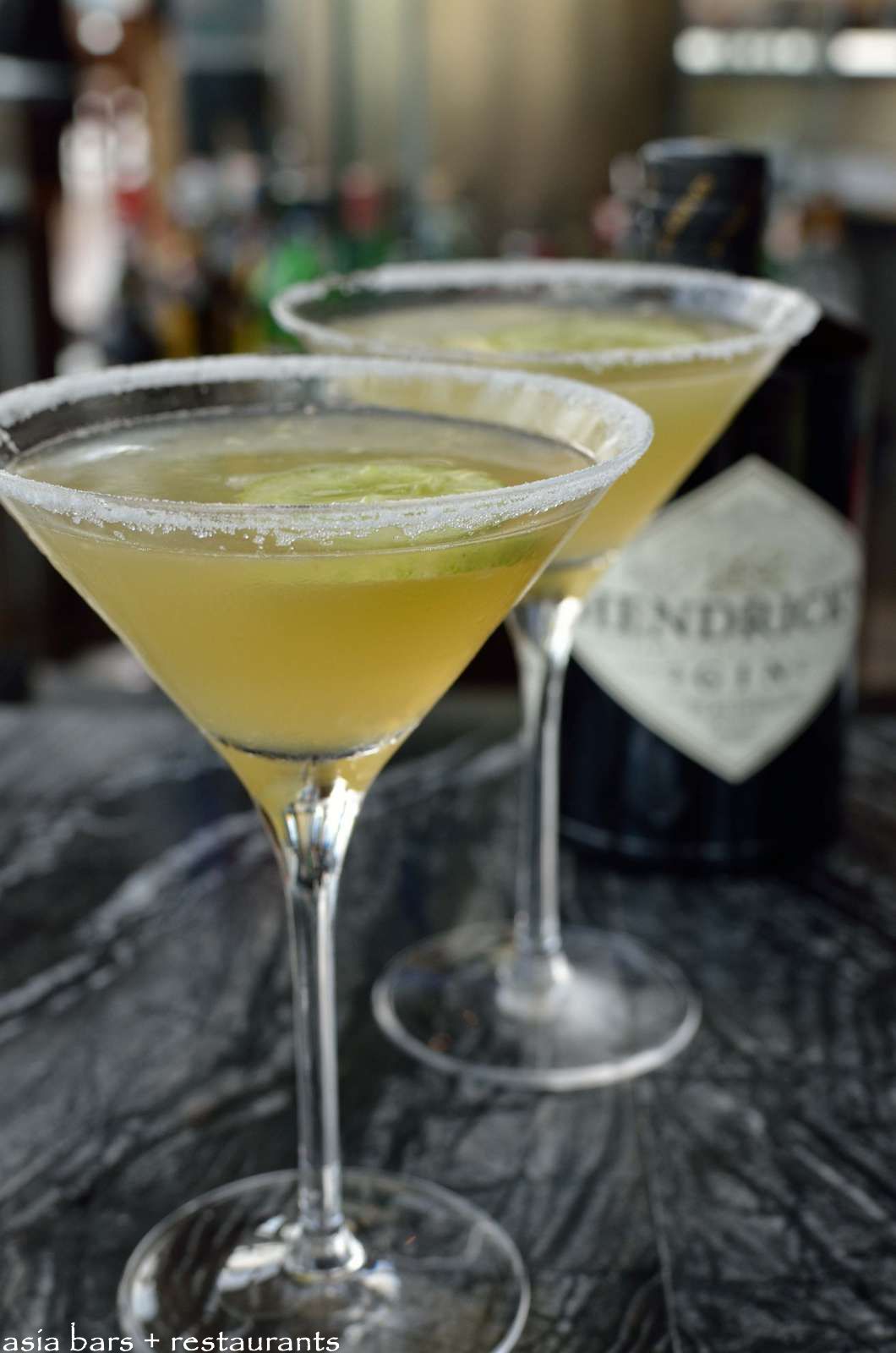 Cucumber Martini- Hendricks Gin, with refreshing cucumber and lemon juice, served in a lemon-rimmed Martini glass.