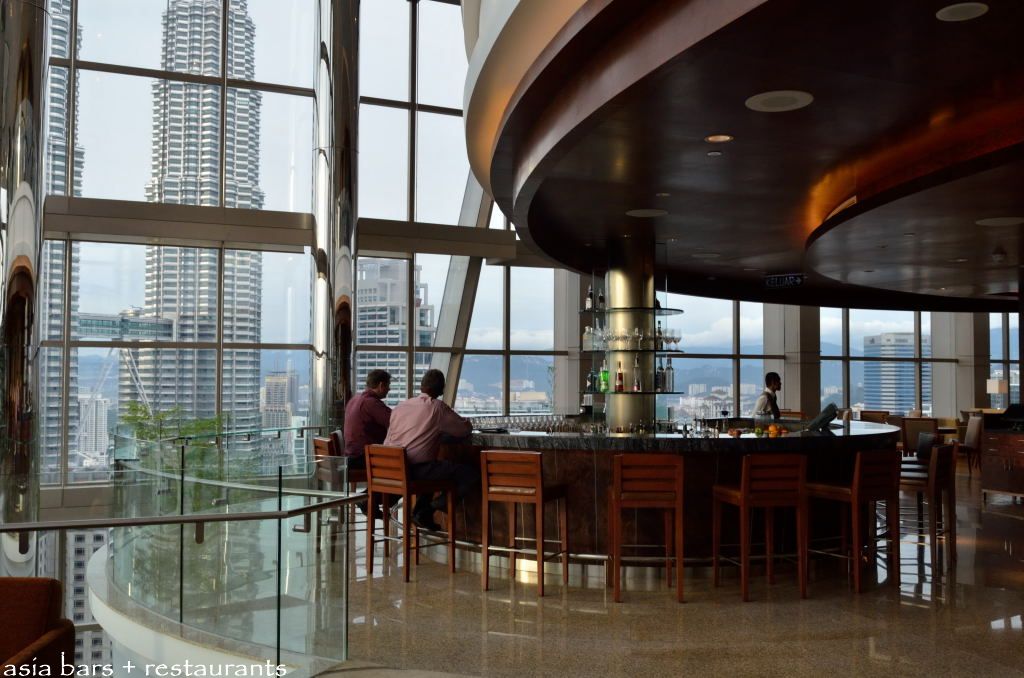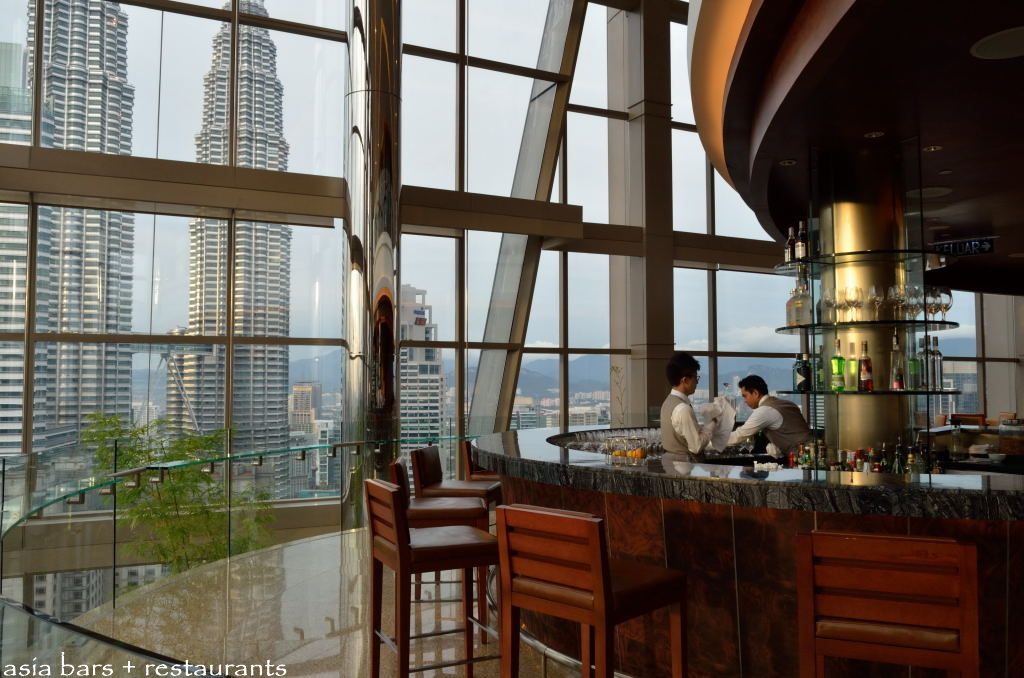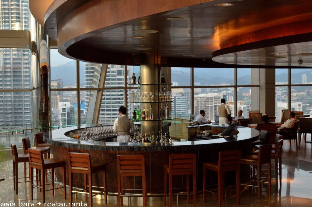 The handsome bar has a solid black marble counter top and walnut veneer paneling. Bar stools are fashioned from solid timber with leather upholstery. And every seat enjoys superb views of the nearby Petronas Twin Towers through the floor to ceiling glass walls.