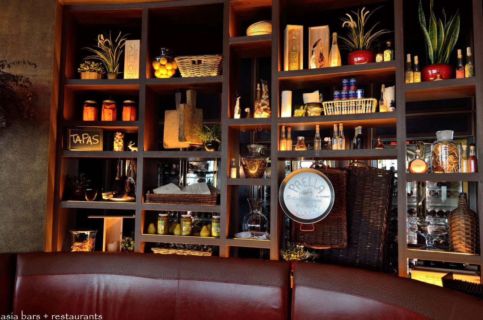 Display shelving on the back wall of the bar lounge area showcasing Spanish cooking paraphernalia and market produce.