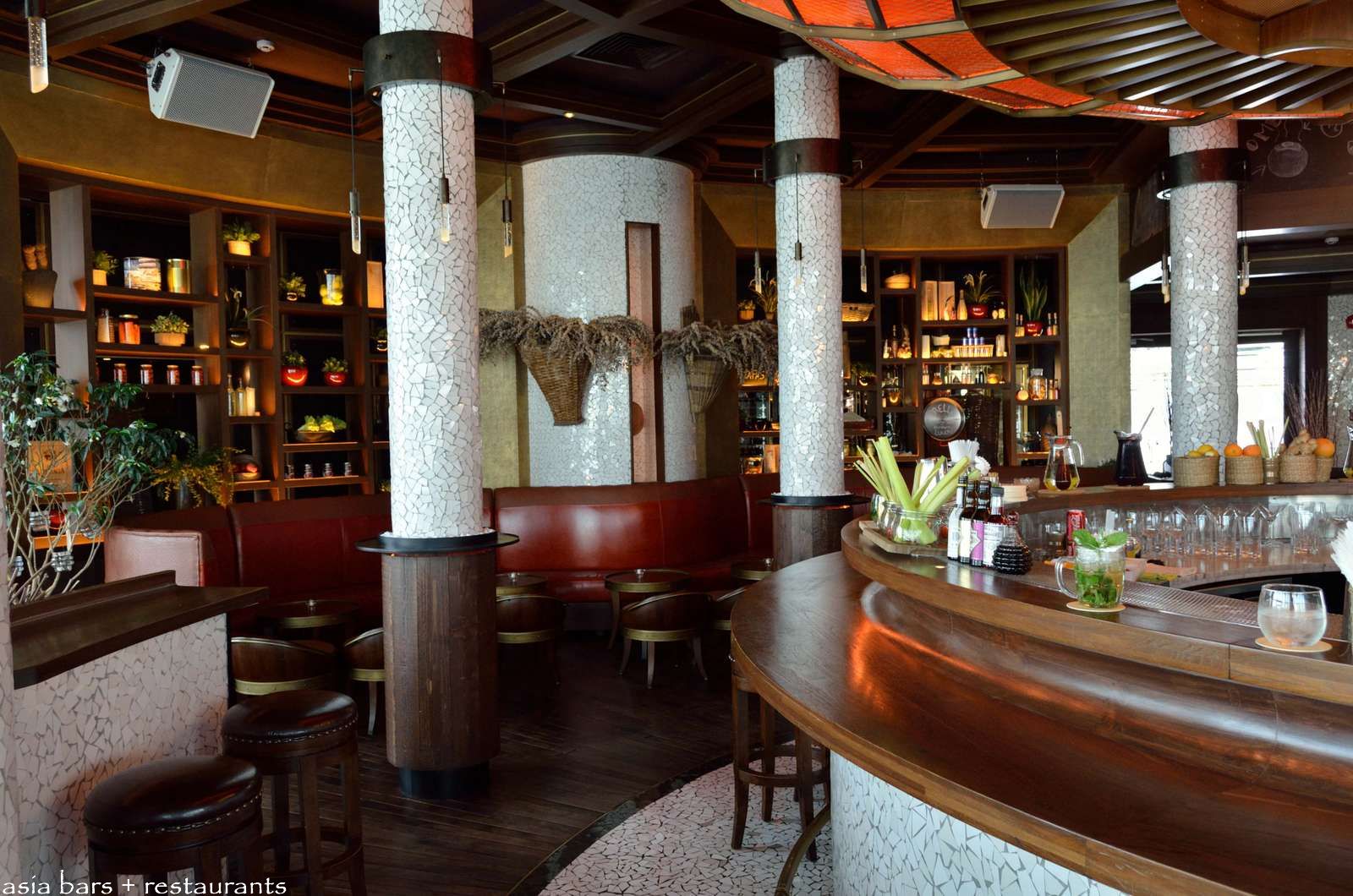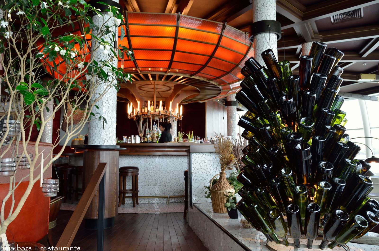 The large circular bar is on a raised section overlooking the restaurant dining tables- with its uniquely dramatic saucer-shaped light installation, fabricated from molded timber, brass and glass- the centre-piece of the entire restaurant space.