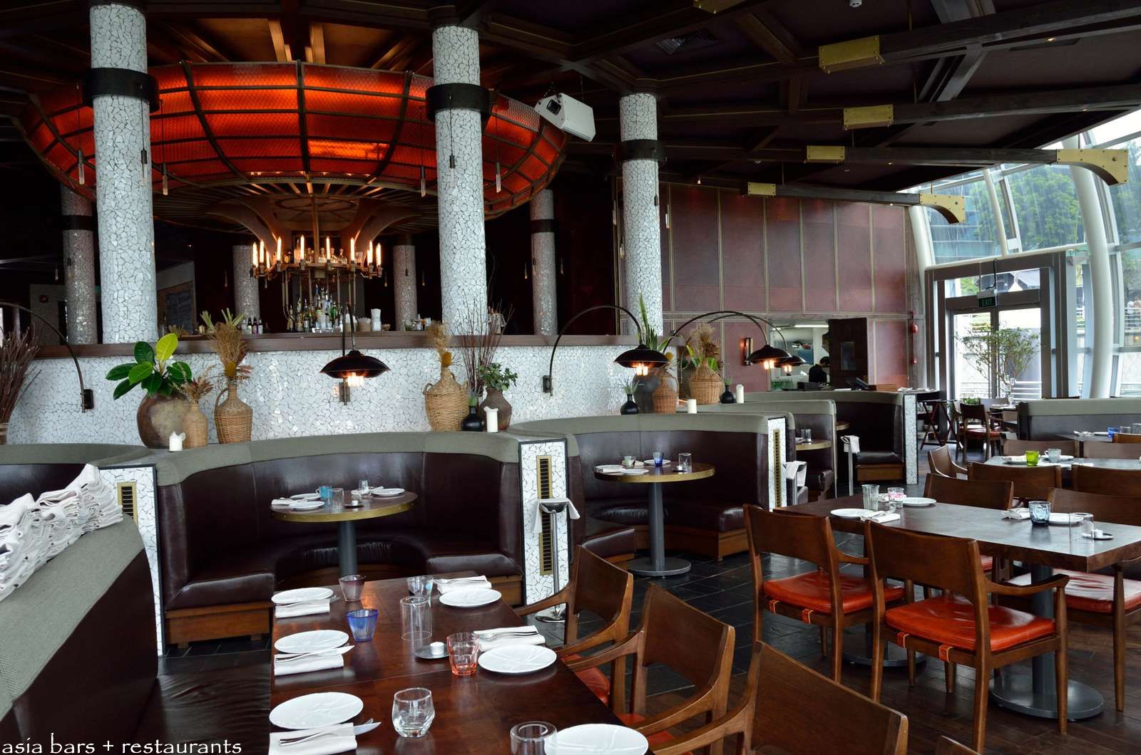 The restaurant features a series of semi-circular booth settings that are wrapped around the base of the circular bar. Tables on the main floor radiate out from the central core to the outer hemispherical glass wall.