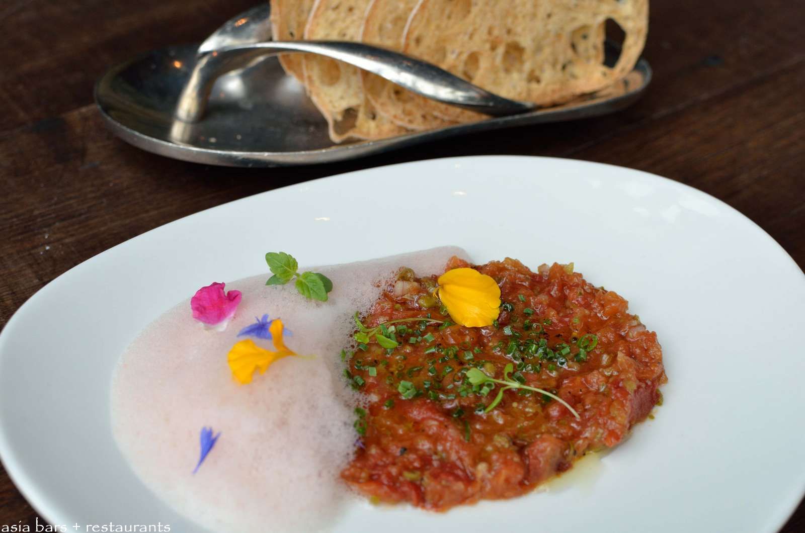 Catalunya Tomato Tartar- from the el Bulli school of molecular transformation- tomato takes on the texture and appearance of beef tartare, accompanied by a tomato-based foam.