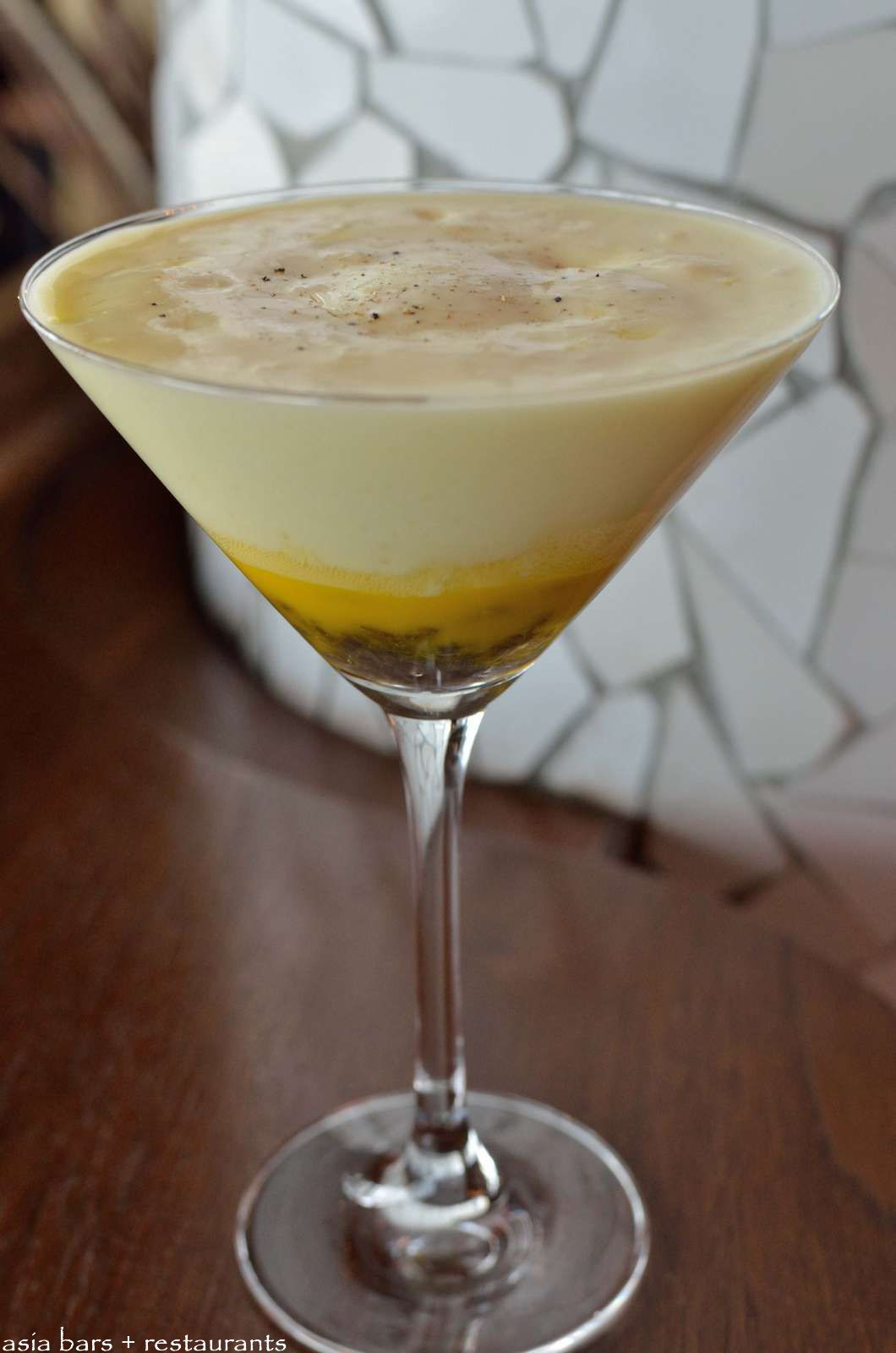 The Other Spanish Tortilla- a dish inspired by the molecular culinary techniques of el Bulli, creating a modern twist on the classic potato omelette- essentially an omelette deconstruction. Served in a martini glass filled with three separate layers of onion confit, egg yolk, and potato foam- and best eaten from the bottom up with a spoon.