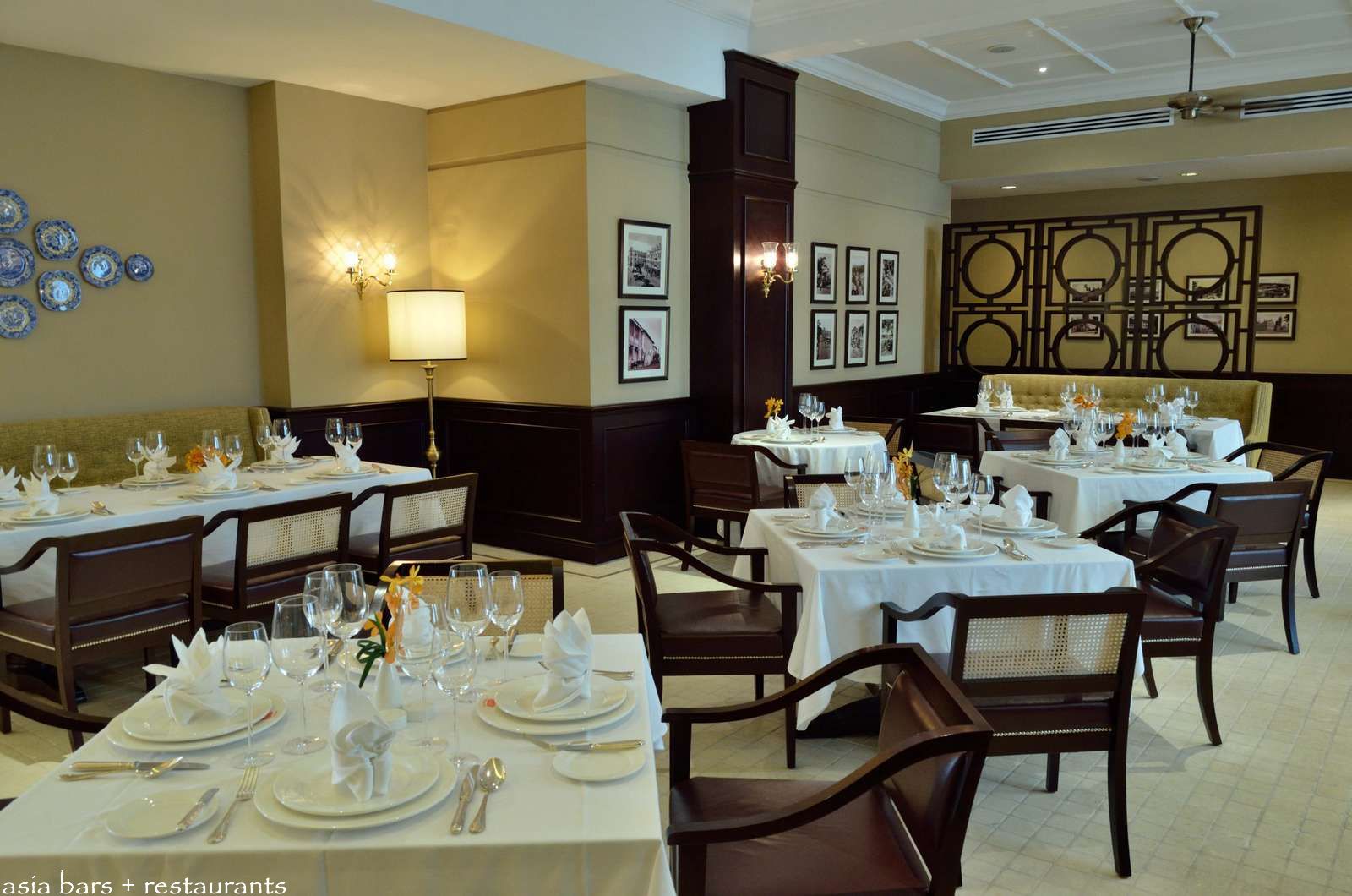 The decor artfully blends contemporary plush banquettes with colonial style timber dining chairs, and crisp white linen table cloths to create a cosy and comfortable dining environment.