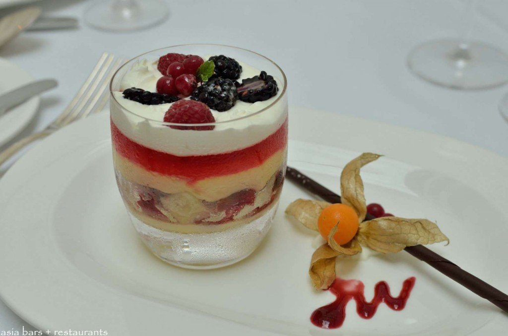 English Trifle- custard, vanilla infused sponge cake, redcurrant jelly. A classic English pudding.
