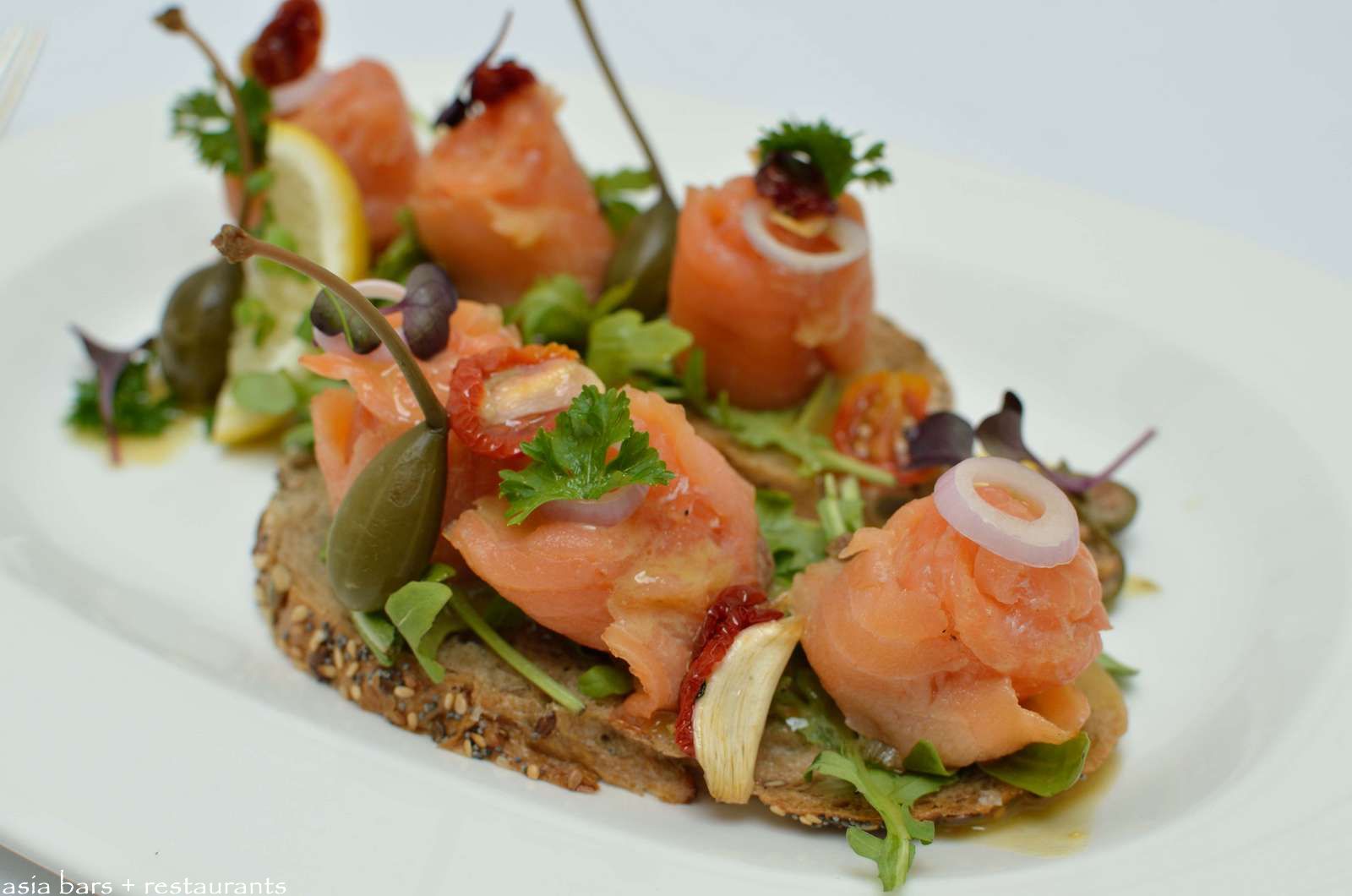 Home-Made Oak Cured Smoked Salmon- served on grain bread with honey mustard