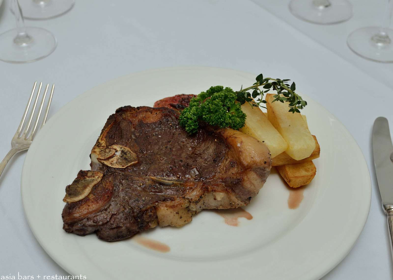 Porterhouse Angus Steak- 16 oz cut. Served with roasted plum tomatoes, black pepper sauce, home-cut steak fries