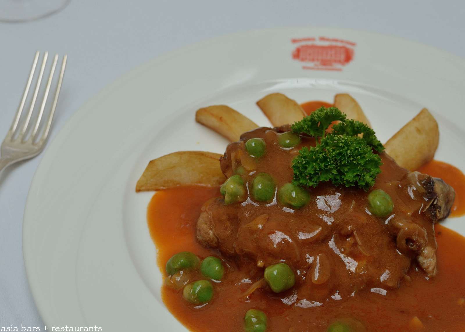Hainanese Chicken Chop- cracker-crumbed deep-fried chicken, garden peas, hand-cut fries, tangy spiced onion-gravy.