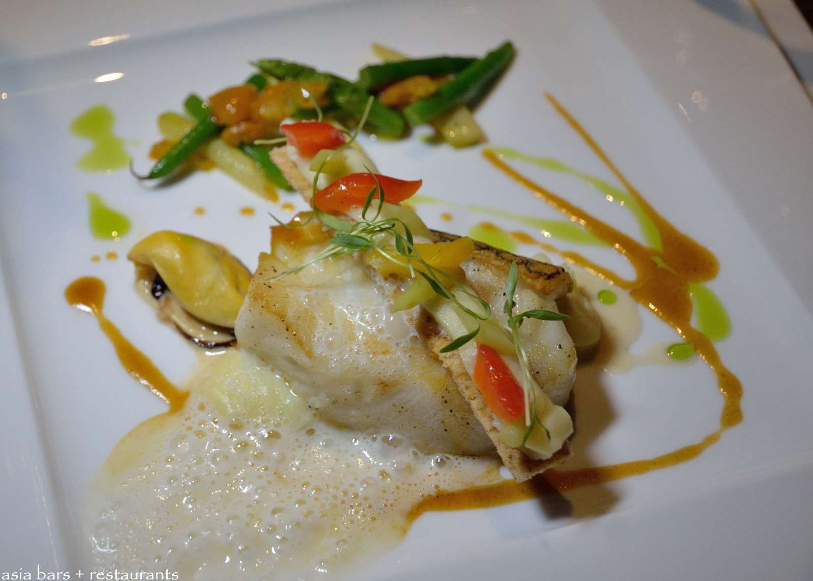 Chilean Sea Bass- Pan seared fillet, asparagus, wild mushrooms, clams & mussels with bouillabaisse sauce. Paired with Veuve Clicquot Rose NV