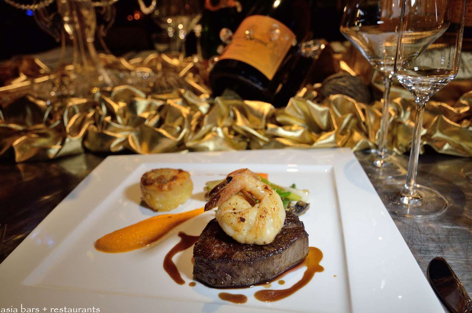 From the Farm to the Ocean- Roasted Wagyu Tenderloin fillet served with tiger prawn, truffle potato, baby vegetables & truffle jus. Paired with Veuve Clicquot Vintage 2004.