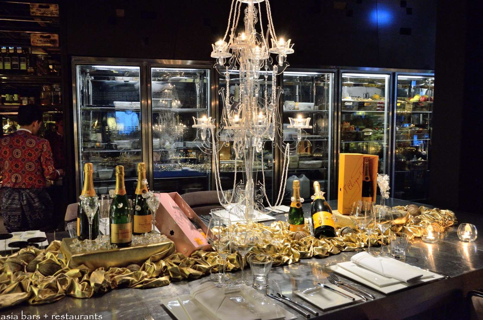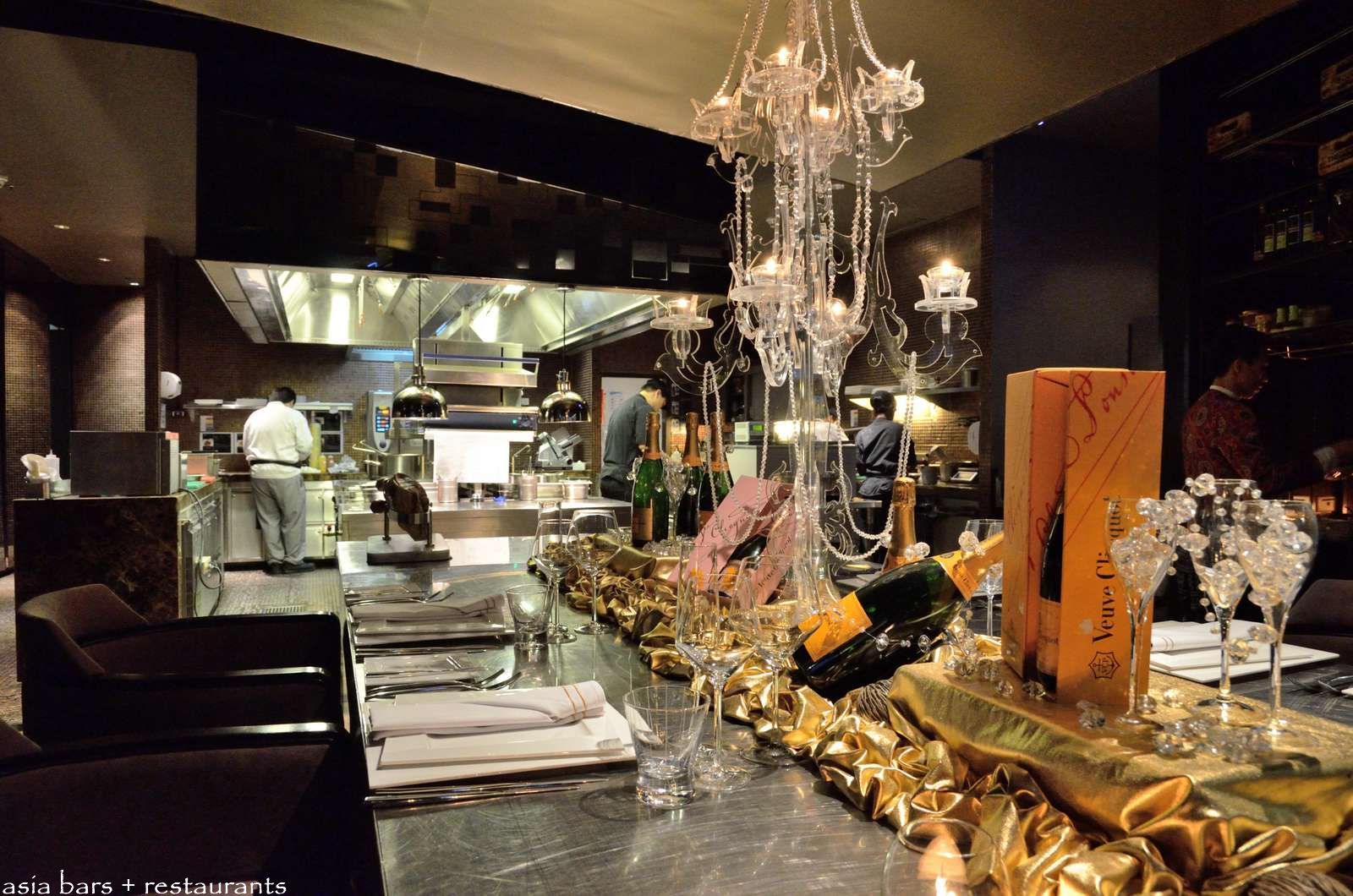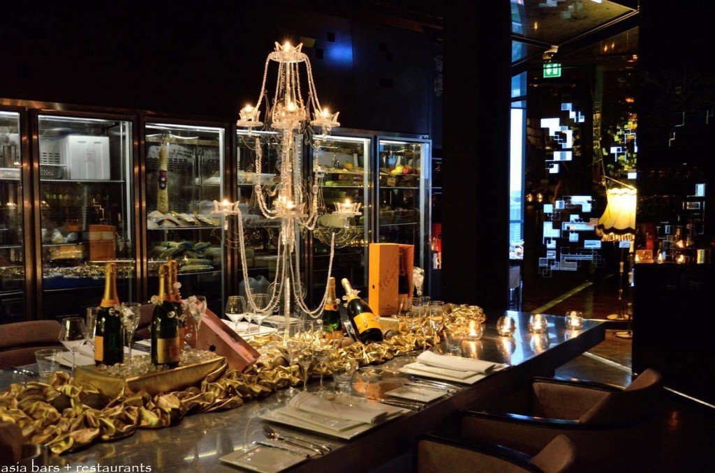 The Chef’s Table at Park Society stands directly adjacent to the open kitchen allowing a close interaction with the culinary team. Table decoration themed especially for the Veuve Clicquot Champagne Dinner during July.
