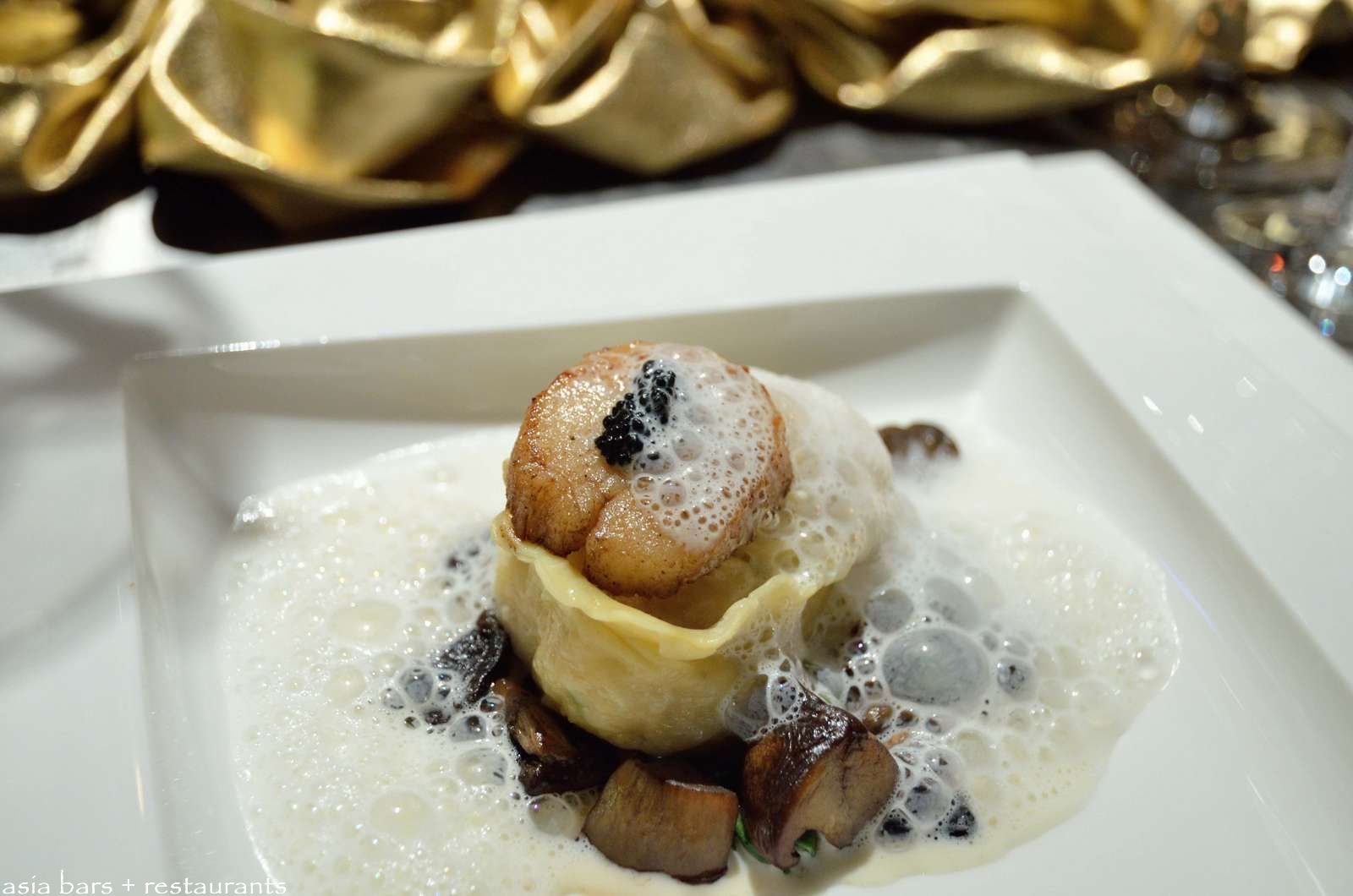 Scallop & Lobster- Pan seared scallop & lobster tortellini with Champagne foam & caviar. Paired with Veuve Clicquot Yellow Label.