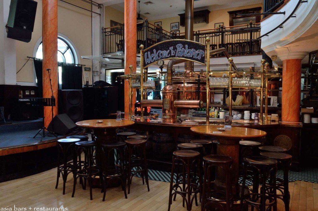 At one end of the massive floor space- the beer serving counter with operational copper kettles and fresh draught beer delivered directly from the micro-brewery beer vats.