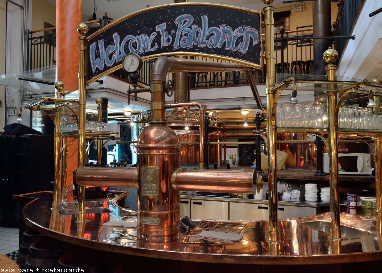 Gleaming copper beer counter and font- a signature feature of all Paulaner Brauhaus.