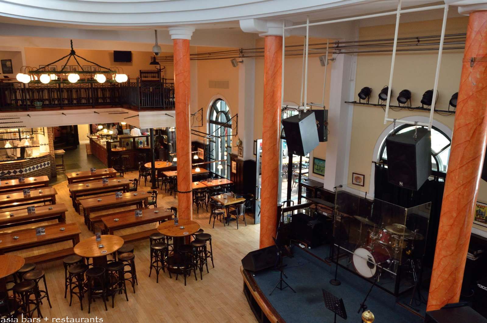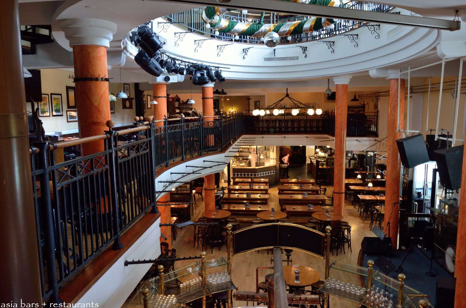 Extending over three levels, the voluminous interior has an impressive scale. The ground floor features traditional Bavarian style wooden tables, the distinctive copper beer kettles, and the band stage.