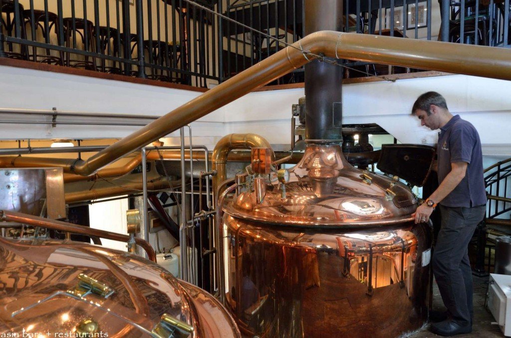 Resident Brew Master checking the contents of the copper kettles behind the ground floor bar counter.